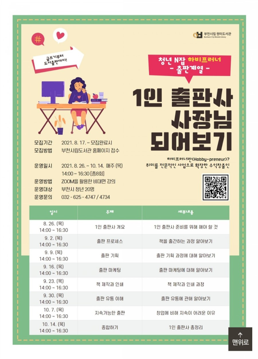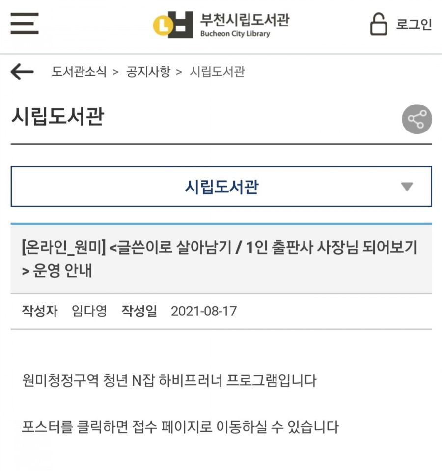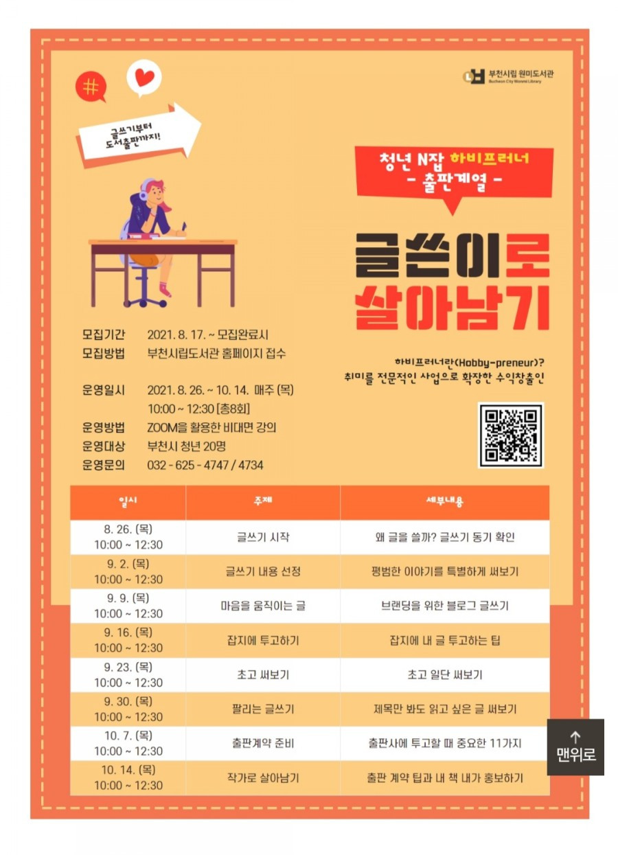 하여, 부천에 계신 청년분들! 작가 이지니와 세나북스 대표님께서 열심히 강의를 준비 중이니, 많은 성원과 관심 부탁드려요! ^^