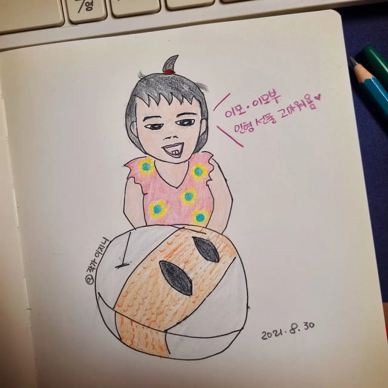 어제 그린 그림을 내 블로그와 인스타그램에 공개했는데, 많은 분이 폭풍 칭찬을 해주셨다. 어쩜 다들 천사의 눈과 마음을 가지셨는지. 하여, 이번엔 오늘 낮에 찍은 우리 딸(생후 8개월)의 사진을 보고 그림을 그렸다.