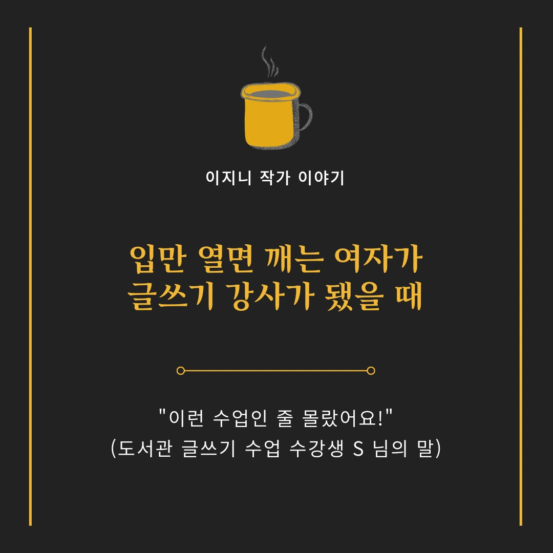 "여러분이 글쓰기 수업을 신청하신 이유가 뭔가요? 수업 내용만 잘 듣기 위해서가 아닌, 수업이 종료된 이후에도 꾸준히 글을 쓰고 싶으셔서 신청하셨을 겁니다. 제가 단 4주 동안 여러분의 글쓰기 실력을 높여드린다는 말은 할 수 없지만, 계속해서 글을 쓸 수 있도록 동기를 부여해 드리는 것만큼은 자신 있게 도울게요!"