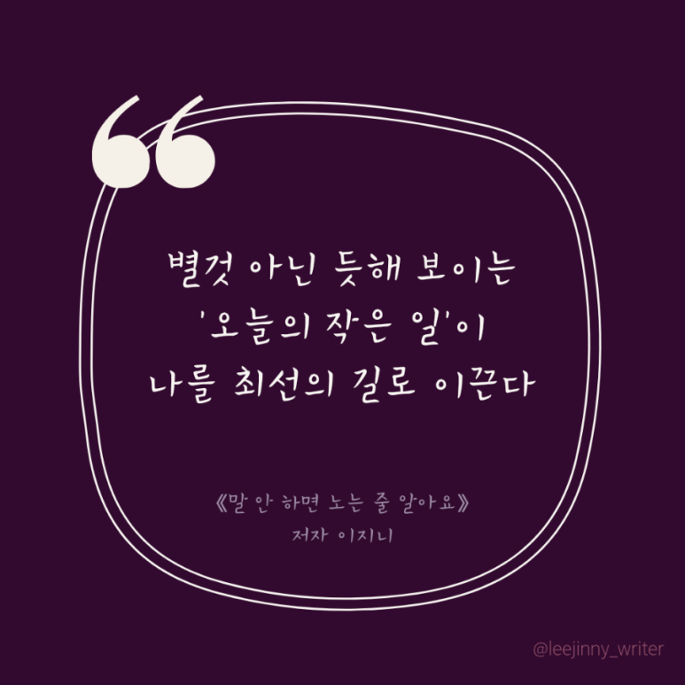 자기계발서를 읽으면 대단한 사람들 천지죠. 그러나 가만히 들여다보세요. 우리와 다른 세계의 사람이라서 좋은 결과를 냈을까요? 아니에요, 차이가 있다면 한 걸음의 실행뿐입니다. 그가 특별히 잘나서가 아니라, 남들 눈에는 별것 아닌 듯해 보이는 보통의 하루를 잘 건넜기 때문이지요. 우리도 출발선을 넘기만 하면 됩니다. 다만, 오늘의 걸음으로 내일이 어떻게 될지는 예측하지 마세요. 그저 하루하루만 보면서 즐겁고 감사하게요. 도중에 슬럼프가 온다 해도 까짓 것, 넘어서는 거예요. 큰 성과를 내지 않아도 좋습니다. 실패해도 괜찮아요. 실패의 다른 말이 ‘또 다른 시작’이라 하잖아요. 우리의 별것 아닌 시작이 훗날 나 자신을 최선의 길로 이끌어 줄 것을 의심하지만 말자고요. 별것 아닌 듯한 ‘첫발’을 무시하면 큰코다칩니다!