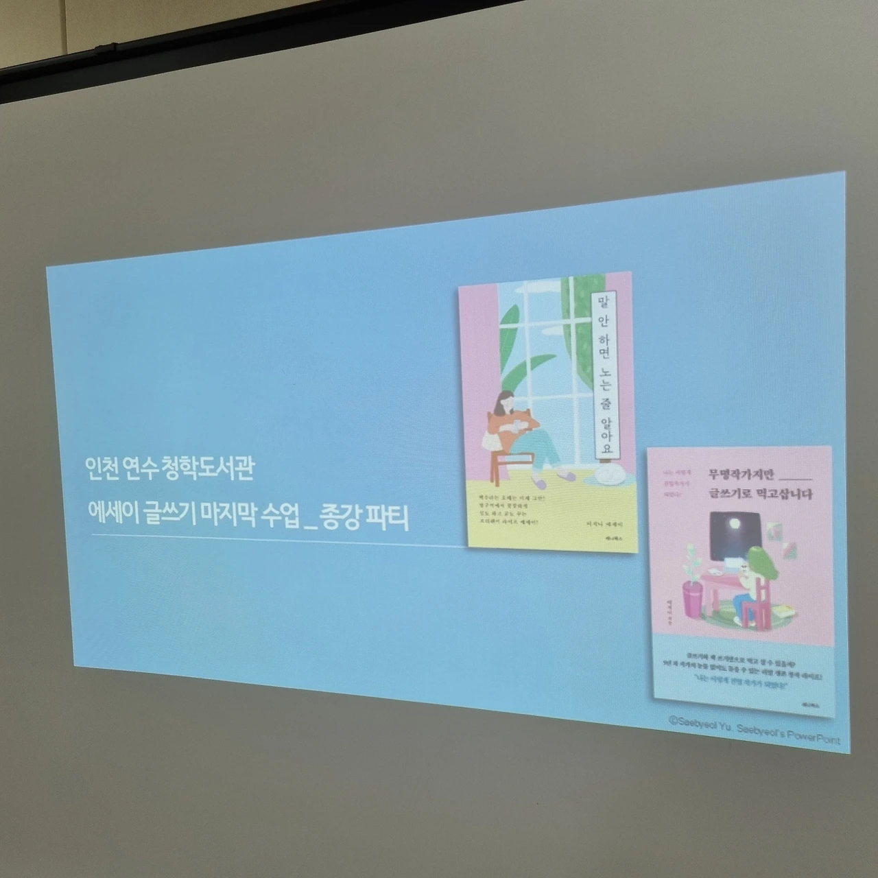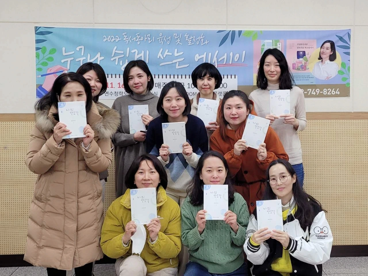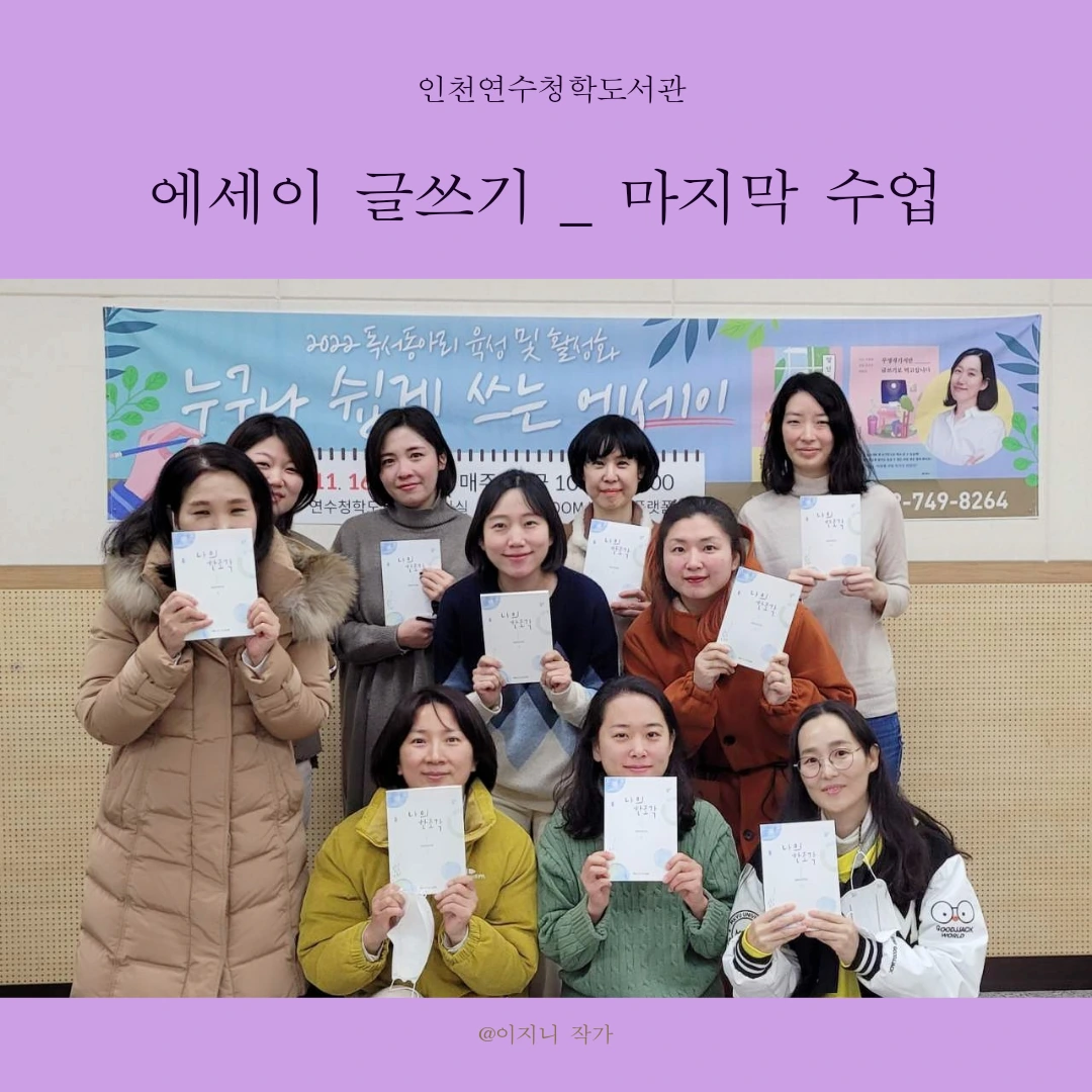 11월 중순부터 6주, 총 12회 차로 진행한 수업이 지난주에 끝났습니다. 어느 수업이든 그렇지만, 마지막은 늘 아쉬워요. 12회 차라는 긴 여정 때문에 학우님들과 정이 좀 더 들어서일까요. 특히 청학 도서관에서의 마지막 수업은 더욱 아쉬웠답니다. 청학 도서관에서 학우님들이 쓴 글을 에세이집으로 엮어 주신다고 해서 결과물까지 만날 수 있었어요! 12회 차 동안 한 명당 총 3편의 글을 썼어요. 맨 처음 쓰는 초고부터 고치고 다듬는 퇴고까지... 자신이 쓴 글을 보고 또 보고 고치는 작업을 하셨지요. 지루할 수 있는 이 과정을 멋지게 해내신 학우님들!