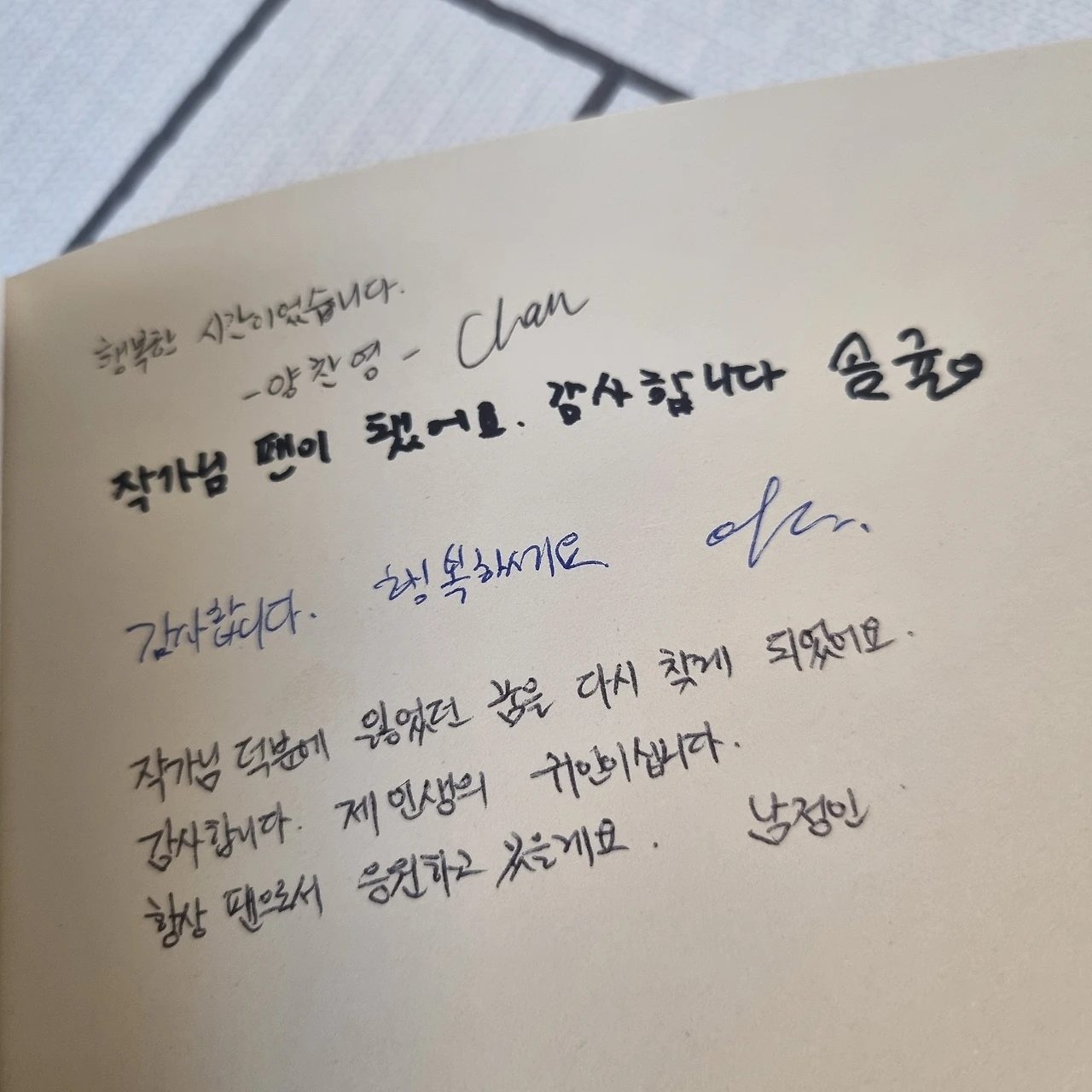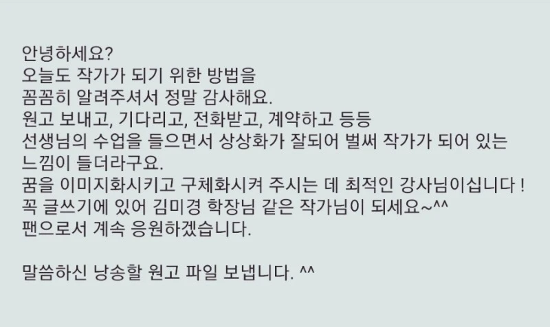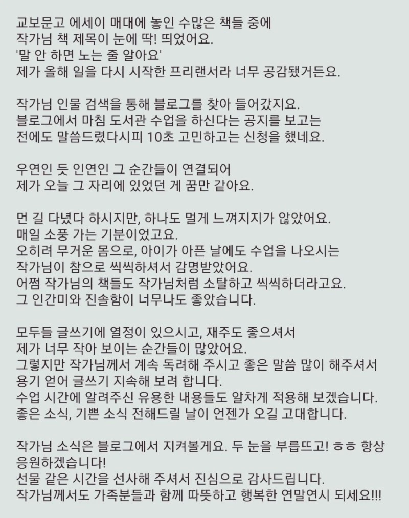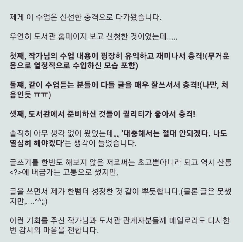 "지금껏 글쓰기 모임뿐 아니라 유료 글쓰기 강의를 적잖이 들었는데요. 작가님의 수업이 가장 알차네요! 온라인 유료 강의하셨으면 좋겠어요! 그동안 진심으로 감사했습니다!"
