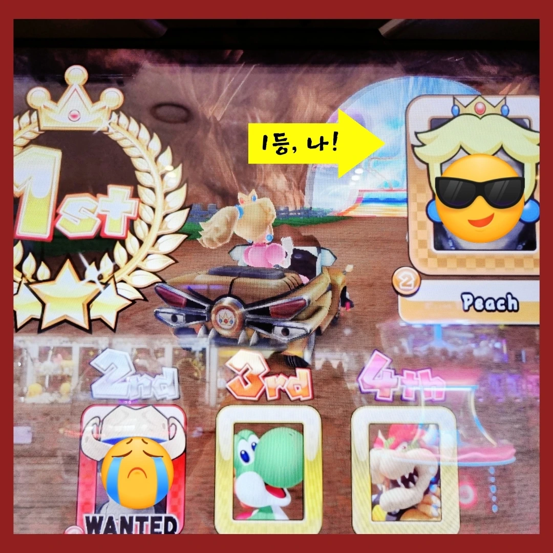 그래! 기분이다! 아래층에 있는 오락실로 향했습니다. 번쩍번쩍 다양한 게임이 가득한 공간에 내 발길은 자동차 경주로 향했어요. 물론 '펌프'가 나를 유혹했지만 숨이 턱까지 차올라 노래 한 곡도 힘겹게 할 것만 같아 못 본 척했어요. (ㅎㅎㅎ) 와, 안 한 지 백만 년이나 된 자동차 경주입니다. 남편과 나란히 앉아 시합하기로 했어요. (둘째는 유모차에서 잠을 자고 있었습니다) 신이 난 우리는 캐릭터와 경주 노선을 골랐습니다. 3, 2, 1! 경주가 시작됐어요. 남편이 나를 앞지를 때마다 액셀을 힘껏 밟았습니다. 아이템 버튼도 사정없이 눌렀죠. 그렇다면 결과는? 와우! 내가 이겼습니다! 장롱면허 18년 차가 운전 경력 20년 차를 이겼어요! 오예!
