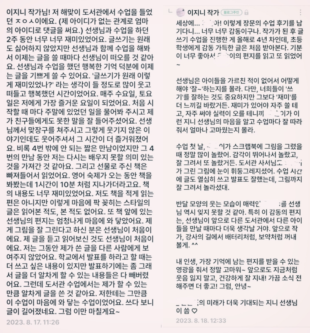 이지니 작가님! 저 해맞이 도서관에서 수업을 들었던 ㅈㅇㅅ이에요. (제 아이디가 없는 관계로 엄마의 아이디로 댓글을 써요) 선생님과 수업을 하던 2주 동안 너무너무 재미있었어요. 글쓰기는 원래도 싫어하지 않았지만 선생님과 함께 수업을 해봐서 이제는 글을 쓸 때마다 선생님이 떠오를 것 같아요. 선생님과 수업했던 행복한 기억 덕분에 이제는 글을 기쁘게 쓸 수 있어요. '글쓰기가 원래 이렇게 재미있었나?'라는 생각이 들 정도로 많이 웃고 떠들고 행복했던 시간이었어요. 매주 수요일, 토요일은 제게 가장 즐거운 요일이 되었어요.