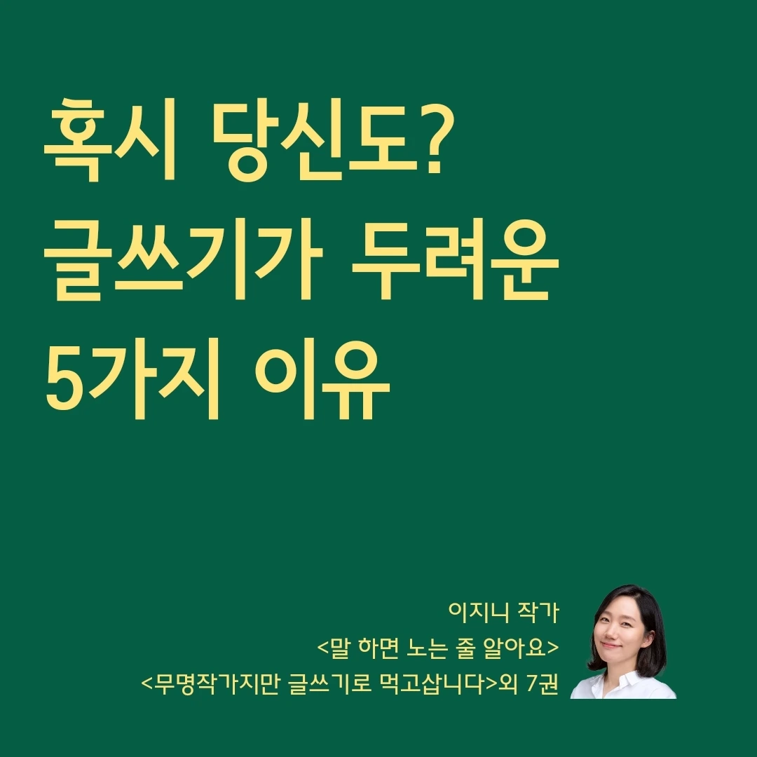이 마음은 왜 생기는 걸까요? 여러 가지 이유가 있겠지만, 이 시간에는 5가지로 이야기해 볼게요.혹시! 이 수업을 듣고 계신 분 중 글쓰기에 두려운 마음이 있다면, 몇 번째 이유인지 보셔요~