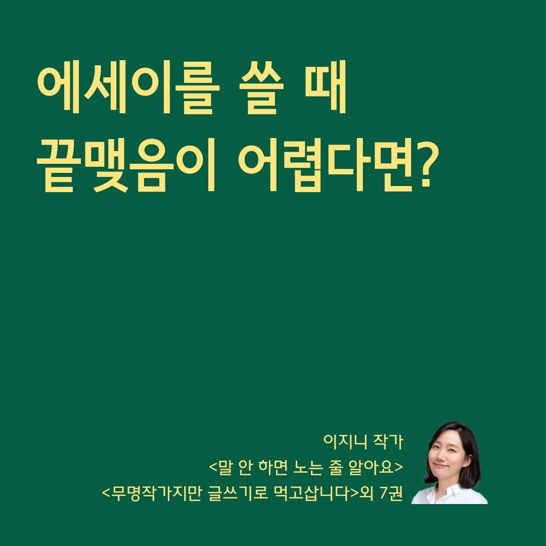 지금 우리는 뭘 배우는 거죠? 에세이! 에세이입니다. 자기계발서가 아니에요. 만약 우리가 쓰려는 글이 자기계발서라면 마무리가 상당히 중요합니다. 반드시 임팩트 있는, 깨달음을 주는, 독자들에게 한 번 더 동기를 부여할 수 있는 말이 무. 조. 건. 필요합니다. 자기계발서는 말 그대로 독자에게 할 수 있다는 힘을 줘야 하니까요.