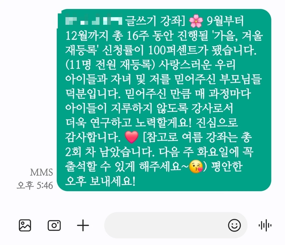 이번 가을, 겨울 강좌를 앞두고, 학부모님들께 기존 아이들의 재수강 의사를 여쭈어보았을 때, 수강률 100%라는 결과를 받았습니다. 이 숫자는 단순한 수치가 아니라, 그동안의 시간이 헛되지 않았음을 증명해 주는 하나의 큰 의미로 다가왔습니다. 아이들이 수업에 다시 참여하기를 원한다는 것은, 제가 그들과 나눈 시간이 그들에게도 소중했음을 의미합니다. 이는 저에게 강사로서의 자신감을 심어주는 동시에, 더 나은 수업을 만들어가야 한다는 책임감도 함께 안겨주었습니다.
