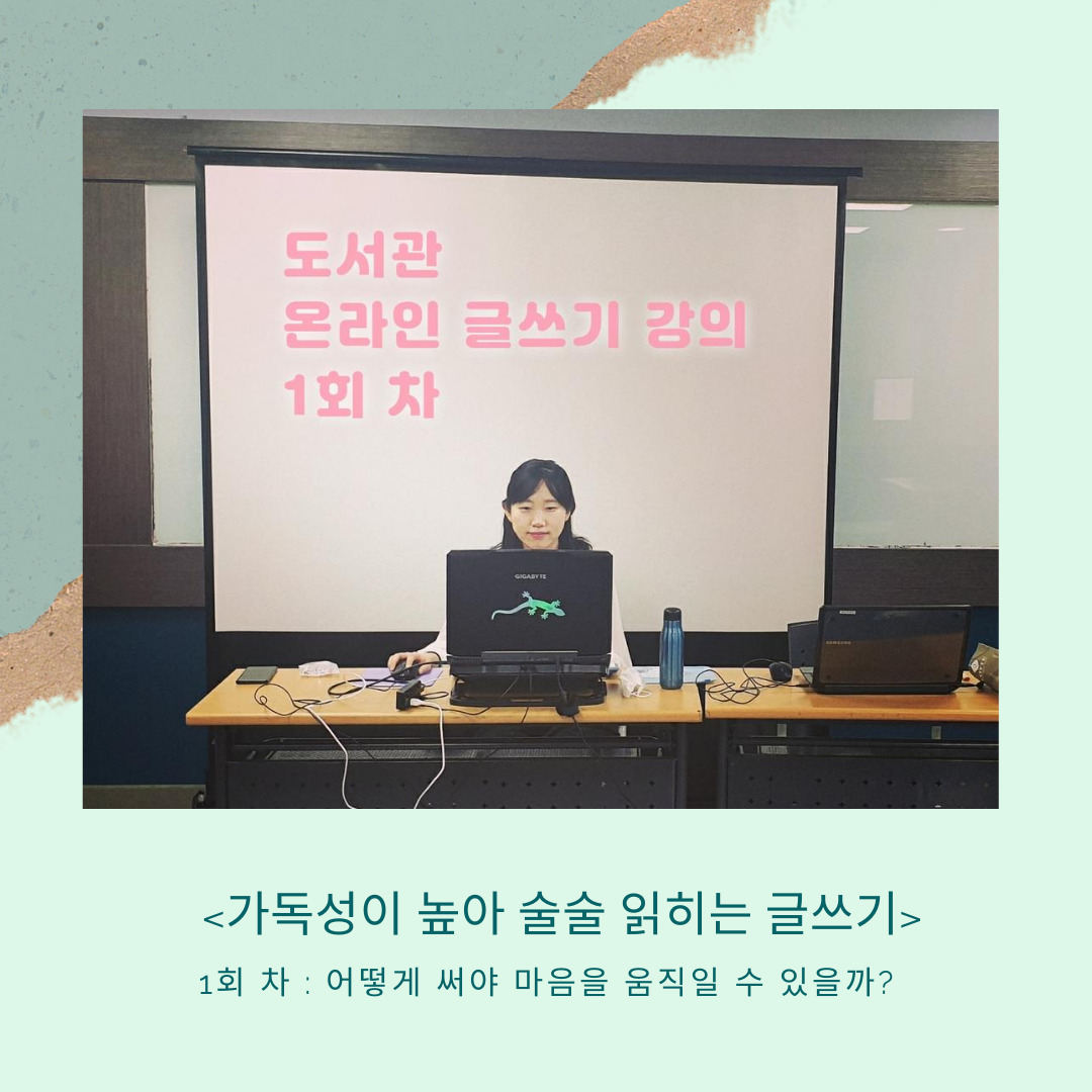 수업 시작이 10시라 9시 반까지 오라 하셨지만, 첫날이기도 하고 긴장도 풀고 싶어, 한 시간 전에 갔다. 도서관 문 앞에 도착하니 정확히 오전 9시! 아, 퍼펙트 한 시작이다. 4층에 가니 담당자님이 있었다. 내 컴퓨터만 켜놓으면 될 만큼 모든 준비를 다 하셨다.
