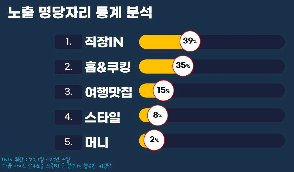 직장 IN, 홈&쿠킹에는 39%, 35%로 브런치 글이 예상보다 큰 포션을 차지하고 있다.3위는 여행 맛집으로 15%다.스타일과 머니 섹션에서도 가끔 브런치 글을 만날 수 있는데 10%에도 미치지못한다. 스타일 섹션은 최근 패션 트렌드, 연예인, 핫 피플을 다루다 보니 전문 잡지의 글이 많다. 머니 섹션도 부동산, 주식, 경제 분야의 정보를팩트 기반으로 다루어야 하니 전문 기자들이 쓴 기사가 대부분을 차지한다.그렇다고 브런치 글 노출이 전혀 안 되는 것은 아니니 '스타일'과 '머니'에 나만의 콘텐츠가 있다면 꾸준히 글을 써 보는것도 좋다.