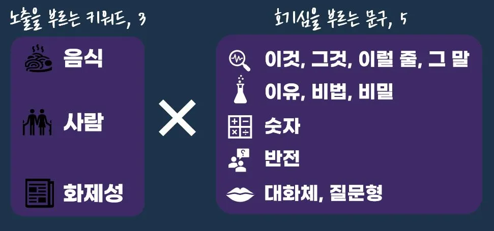 이유, 비법, 비밀 : 궁금증을 유발하는 단어로 숫자와 결합하여 사용한다.