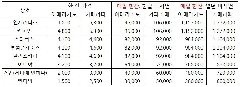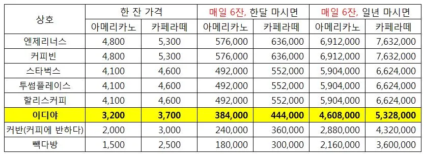 나의 경우처럼 6잔을 마신다면, 이디야 커피 기준 아메리카노를 일년에 460만원, 카페라떼는 533만원을 마시고 있는 꼴이다. 스벅으로 한 등급 높여 마시면 600만원을 넘는다.