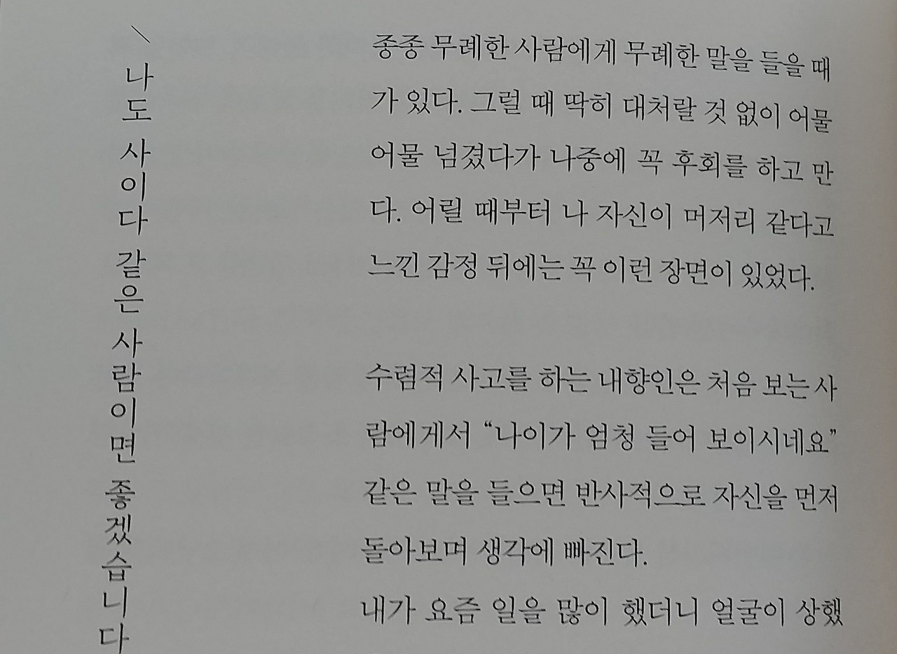 그래서 책을 덮으며 마지막으로 든 생각은 '맞네. 남인숙 작가님 100% 내향인 맞으시다.'