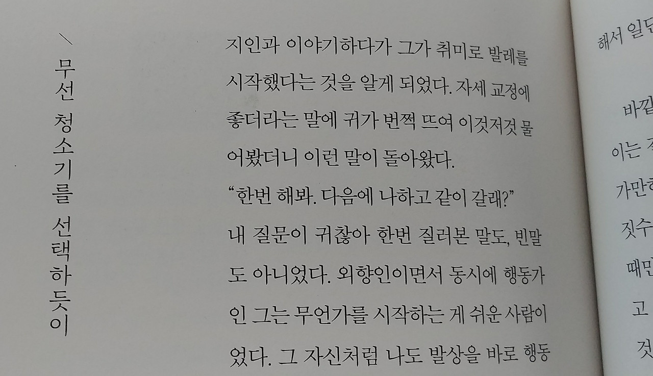 그런데 그렇게 못마땅한 물건이 들어온 이후, 집안 풍경이 달라지기 시작했다. 먼지가 예사로 굴러다니던 바닥에서 머리카락 한 올 찾아보기 힘들어진 것이다. 이유는 간단했다. 무선 청소기가 청소의 '시작'을 휘워지게 만들었기 때문이다. (중략) 한때는 작심삼일이라도 자주 하면 된다는 말을 새겨들었는데 이제는 작심 자체를 하지 않기로 했다. 굳이 마음먹고 시작을 하지 않아도 그 과정에서 필요한 만큼 저절로 신경이 쓰일 테니 시작에 드는 힘이라도 줄이고 싶다. '어떻게든 굴러가겠지' 하는 마음으로 무선 청소기를 꺼내 드는 삶이란 얼마나 가벼운가.