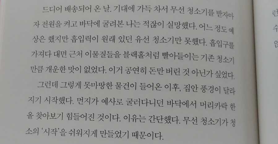 기대에 가득 차서 무선 청소기를 받자마자 전원을 켜고 바닥에 굴려본 나는 적잖이 실망했다. 어느 정도 예상은 했지만 흡입력이 원래 있던 유선 청소기만 못했다. (중략)