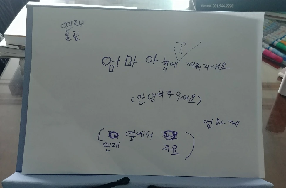 숙취가 덜 깬 수요일 새벽, 둘째가 적어 둔 메모를 보고 머리를 띵 한대 얻어맞았다. 이 녀석이 엄마가 회식한다고 집에 늦게 들어오니 잠들기 전 메모 한 장을 남겨 두었다. 어떻게 현관 바로 문 앞에 떡 하니 놓아둘 생각을 했을까? 집에 늦게 들어오는 엄마가 행여나 못 볼 까 봐, 엄마의 발이 처음 닿을 것으로 예상되는 자리에 놓아둔 녀석. 개학 날이라 아침에 일어날 것이 심히 걱정되었나 보다.