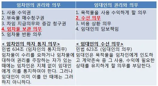 임대인은 목적물을 임차인에게 인도하고 계약 존속 중 그 사용, 수익에 필요한 상태를 유지하게 할 의무를 부담한다.