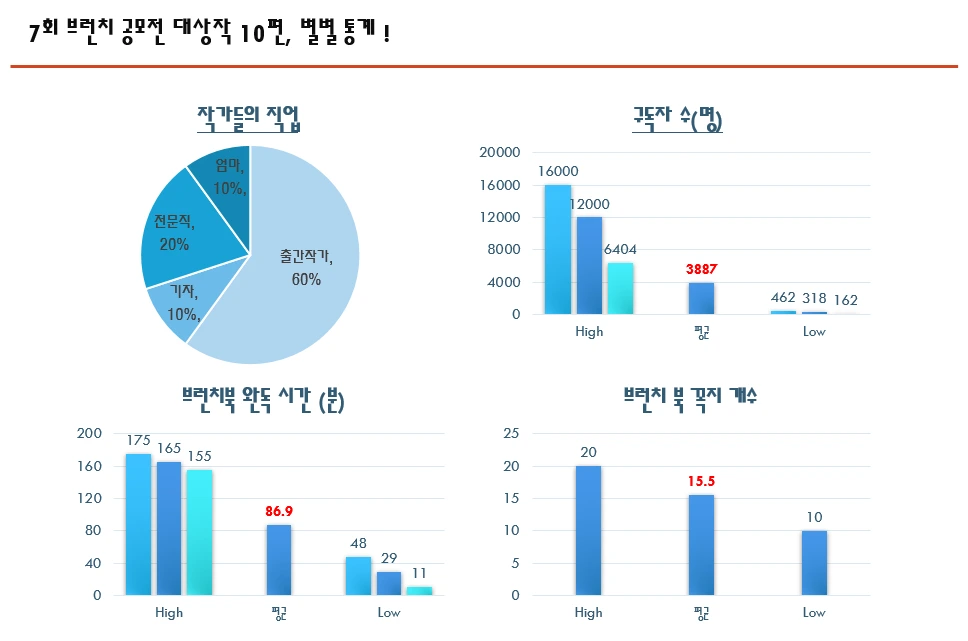 평균 15.5개. 적게는 10화부터 많게는 20화까지 글이 구성되어 있었다. 브런치 북이 쉽게 읽히지 않는다는 글을 종종 보았다. 엄연히 한 권의 책인데 쉽게만 읽고 싶다는 건 욕심이 아닐까 한다. 20화에 달하는 브런치 북을 읽을 때 피로도가 올라가는 건 사실이지만 그럴 땐 잠시 쉬면 된다. 브런치 북 '이어서 보기' 기능이 그래서 생긴 것이니 잘 활용하면 된다. 한 작가의 땀이 깃든 브런치 북이 읽기 불편하다는 이유로 묻히지 않길 바랄 뿐이다.