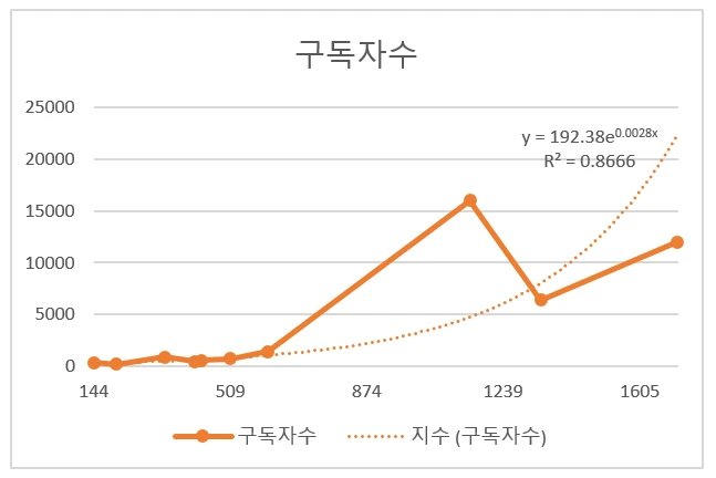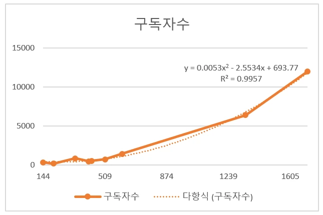 그래프에서 가로축은 '브런치 입문한 기간(일), 세로축은 구독자 수다. '브런치 입문 기간'은 10명 작가님들의 작품을 뒤져 최초 발행한 글의 날짜를 찾아내 계산하였다.