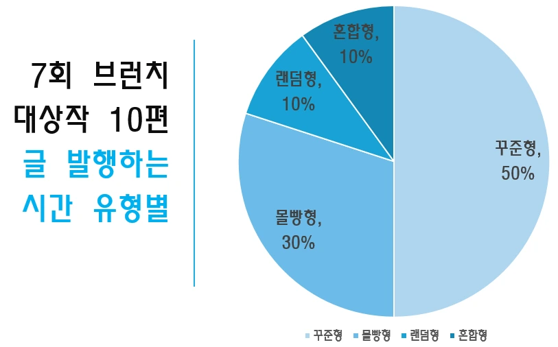 며칠간에 걸쳐 글을 무더기로 발행한 경우다. 몰빵이라 하여 벼락치기 공부나 한탕을 노리는 도박을 떠올렸다면 오산이다. 몰빵형으로 글을 올리는 것이야 말로 가장 계획적이고 지능적이다.글의 기획의도와 탄탄한 목차를 만들 수 있는 최선의 방법이다. 글을 기획하여 목차를 짜고 초고를 다 쓰고 거기다 퇴고까지 한 뒤 글을 발행했을 확률이 높다.(제 개인적 의견입니다.)몰빵형 3분 중에 2분의 작품이 기획력 높은 글에 뽑힌 것(지난 글 참고)은 우연이 아니다. 몰빵형인김선지 작가, 김혜령 작가 그리고 강병진 작가님의 치밀한 계획은 고뇌와 연구 없이 이루어지지 않는다.