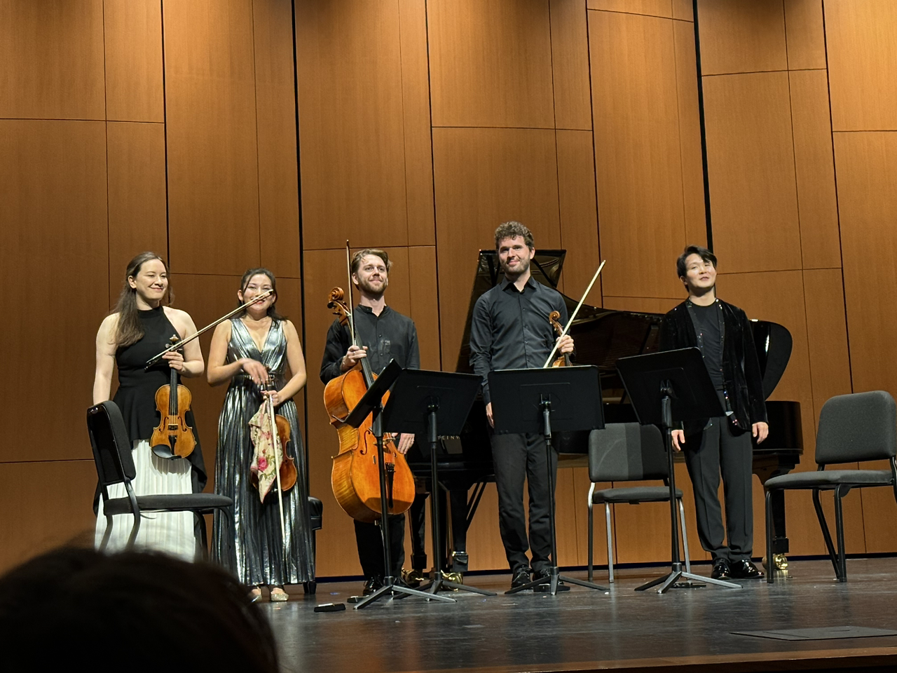 그렇게 우울한 한 주를 보내며, 챔버뮤직 공연 중 프랑크의 피아노 오중주 곡을 듣게 되었다. 여름 페스티벌 공연 목록과 연주자 명단이 나왔을 때, 사실 이 공연은 선우예권 피아니스트가 온다기에 바로 구매 해 둔 티켓인데, 연주하는 곡을 예습할 겸 미리 들어보니 참으로 우울한 바단조의 곡이고, 처음부터 끝까지 계속 진지하고 무거워서 약간 당혹스러운 정도였다. 그런데 이번 주에 회사에서 이런 일을 겪고 나니 그 어떤 곡 보다 내 심정에 딱인 것 같아 공연 자체가 오히려 기대가 많이 되었다. 목요일과 토요일 같은 프로그램을 다른 두 장소에서 듣게 되었는데, 개인적으로는 토요일 Reed college에 있는 Kaul auditorium에서 사운드도 좋았고, 두번째 공연이어서 그랬는지 모르지만 선우예권의 피아노와 함께 연주한 Opus13 quartet과의 합이 그 날 훨씬 나았다. Opus13 Quartet (사중주단)은 스웨덴-노르웨이 출신의 젊은 연주자들로 구성된 실내악단인데 무려 올해 4월에는 실내악 콩쿨 중 매우 권위있는 영국의 위그모어홀 콩쿨에서 우승 했고, 5월에는 프랑스의 보르도 현악사중주 콩쿨에서 우승을 했다고 한다. 노르웨이 출신의 1바이올리니스트 Sonoko Miriam Welde소리가 정말 좋았는데 피아노와 동일 선율을 연주하는 유니즌 구간에서도 다들 프로답게 척하면 척스러운 호흡으로 연주했다. 현악 사중주 악단으로 활동하는 팀을 보면 보통 웬만큼 성격이 맞지 않고서야 오래가기 힘든데, Opus13은 리드 바이올리니스트가 참 잘 끌고 나가는 듯 했고, 서로를 잘 살피며 연주하는 모습을 보였다. 개개인의 실력도 중요하겠지만 조화로운 소리와 섬세함을 잘 표현해야하는 현악 사중주/실내악곡들은 아무래도 한 팀으로 오래 함께한 그룹이 페스티벌에서 잠깐 만나서 공연하는 경우보다 소리가 좋은 것은 어쩔 수 없다. 피아니스트 또한 혼자 연주하거나 큰 오케스트라와 함께 하는 것이 아닌 겨우 바이올린 두대, 비올라와 첼로가 같이 소리를 내기 때문에 강약 조절에 매우 조심해야 하고 사운드가 잘 어울어지도록 현악기의 소리를 들으며 연주해야 한다. 명불허전 선우예권은 역시나 배려심이 가득한 연주를 들려주었다. 선우예권의 낭만주의 곡 소리를 개인적으로 참 좋아한다.