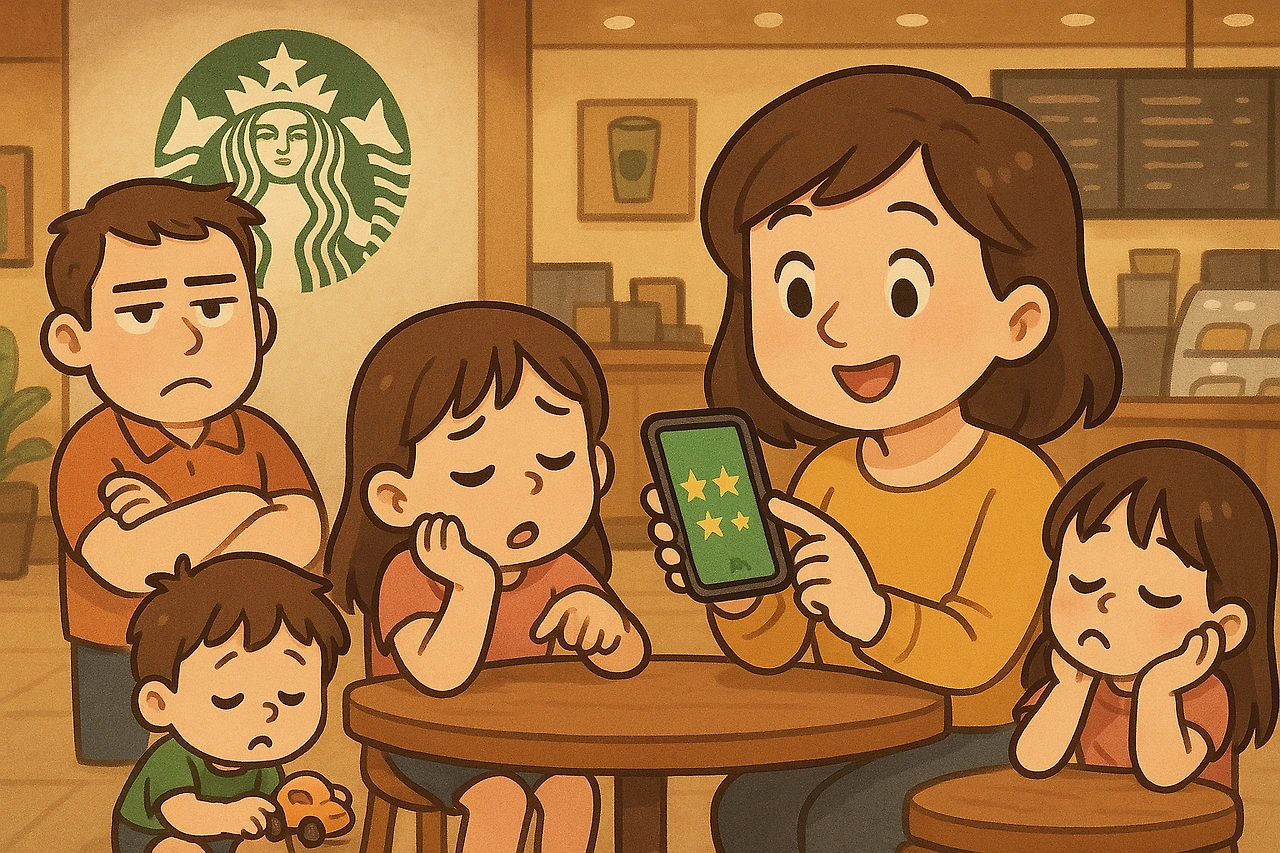 예를 들면, 스타벅스에서 최대한 많은 별 적립을 받기 위해 개인 텀블러를 사용하는 것은 기본이고, 어플(사이렌 오더)로 주문하면 별을 더 받는 이벤트 중에는 꼭 자리에 앉아서 사이렌 오더로 주문했으며, 한 음료를 주문하고 3분 뒤에 다른 음료를 주문하면 별을 또 받을 수 있기 때문에 우리는 항상 한 번에 주문을 하지 않았다. 우리 가족은 언니와 남동생까지 총 5명인데, 다섯 잔을 3분 텀으로 다 따로 주문하는 셈이다. 이 모든 건 당연히 통신사 할인도 받으며 진행된다. 이제 사위도 두 명이나 추가되어서, 만약 7명이 모인 상황에 스타벅스에서 이렇게 주문한다면 모두 주문하고 음료를 받는 데 30분이 걸릴 수도 있다.