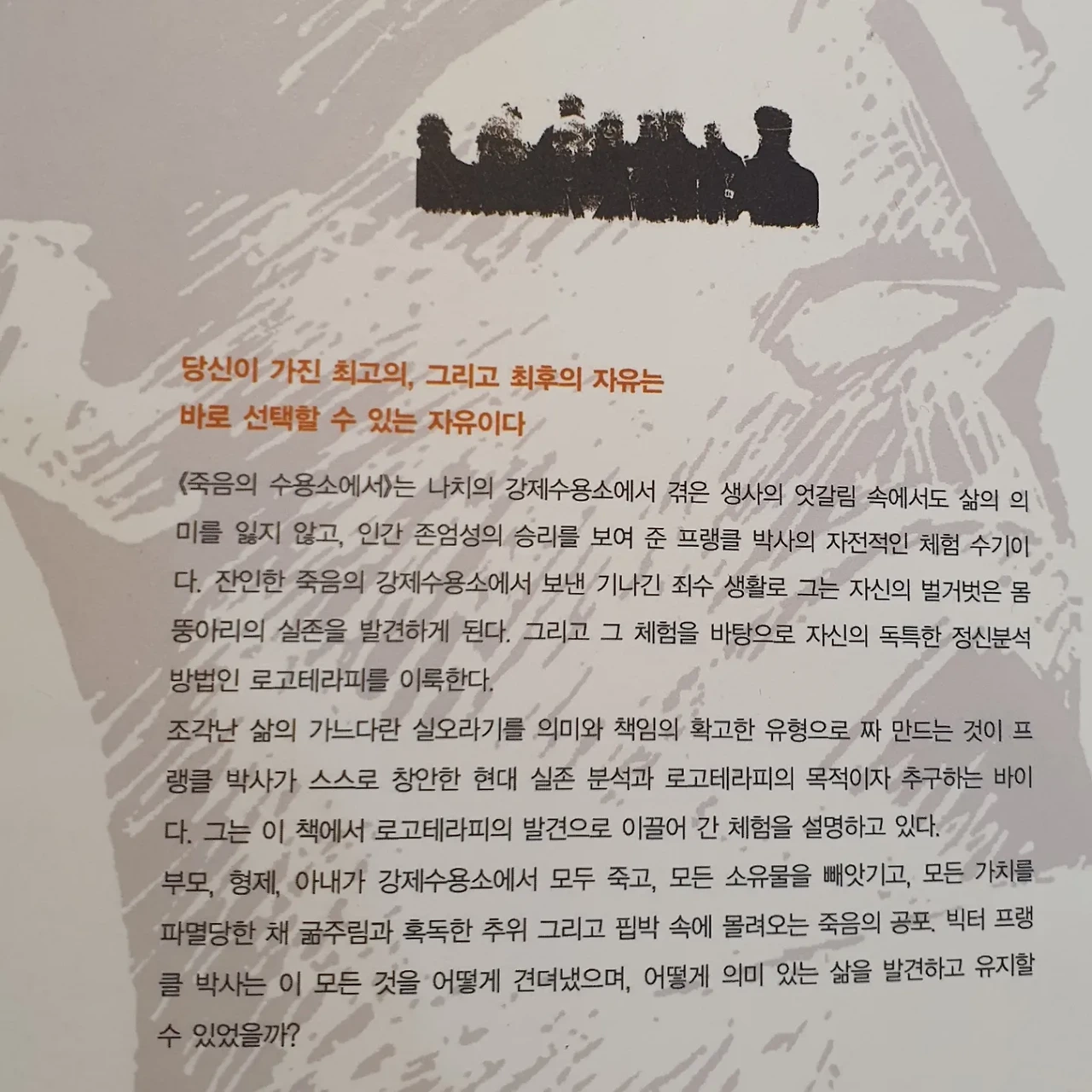 지은이 빅터 프랭클 박사는 정신과 의사로 수용소에서 부모, 형제, 아내를 잃게 되었는데요. 극한 상황에서 수면부족, 식량부족, 정신적 스트레스를 받는 상황에서 그는 어떤 삶의 의미를 깨닫게 되었을까요?