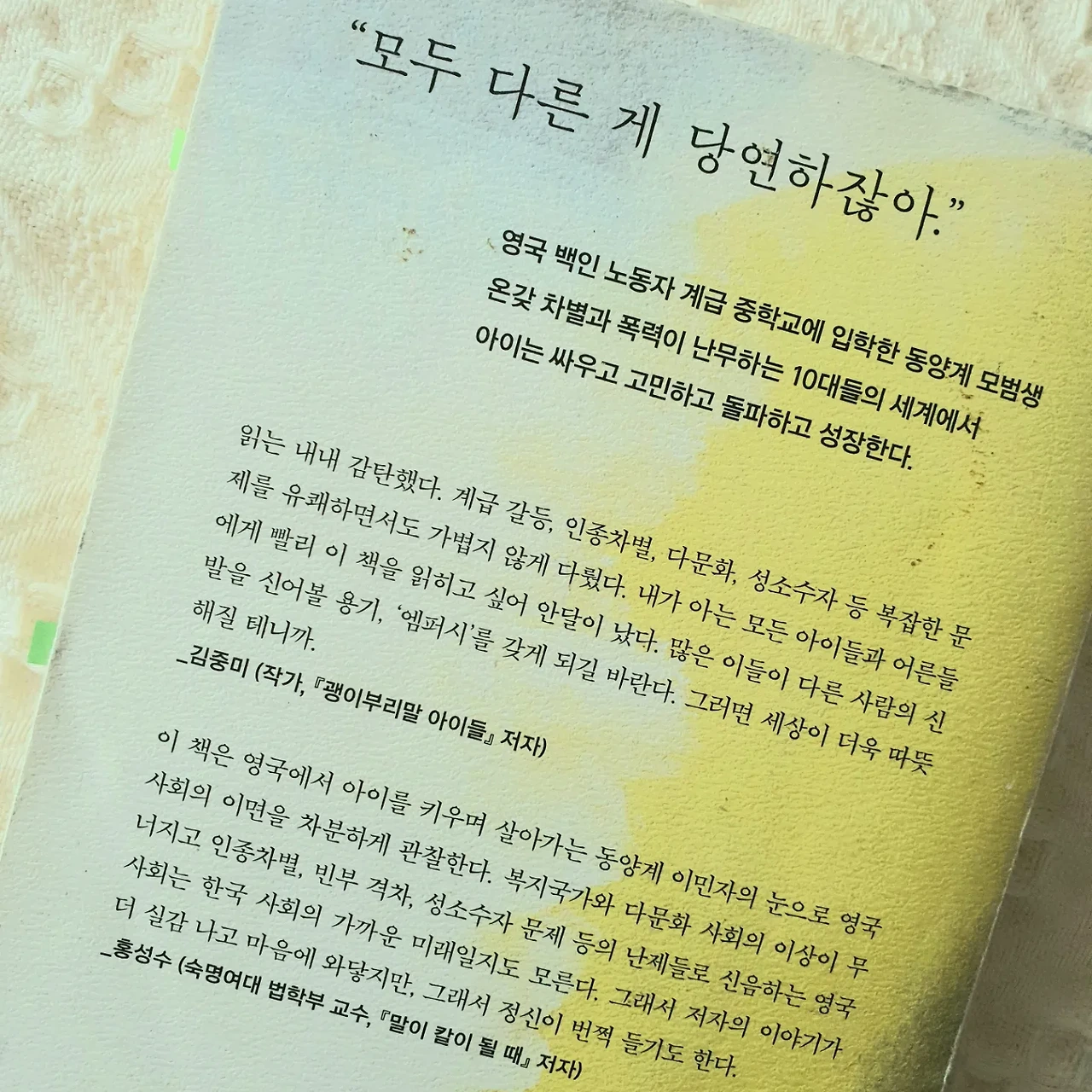 아빠는 영국인, 엄마는 일본인 사이에 태어난 아이는 혼혈아다. 어느 나라에서든 인종에 대한 차별이 존재한다. 그걸 '차별'로 깊이 느끼면 가슴에 상처를 얹고 살 것이고, 그걸 '차이'로 느끼면 마음이 안개처럼 싸여 먹먹하지는 않을 것이다.