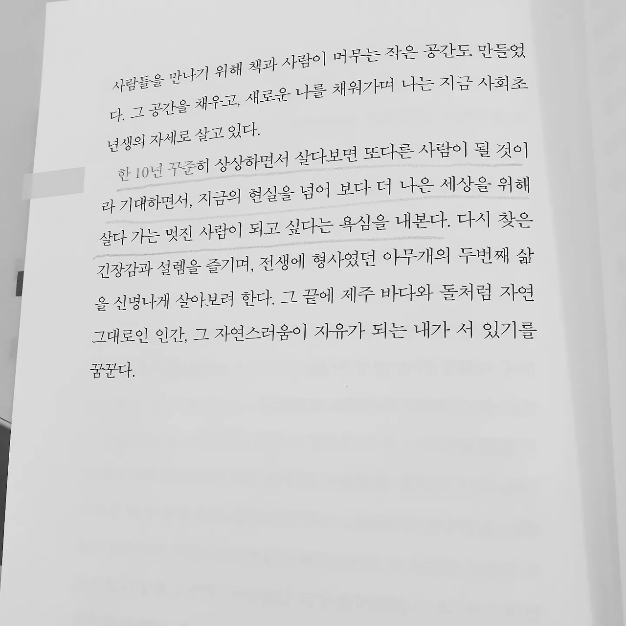 “한 10년 꾸준히 상상하면서 살다 보면 또 다른 사람이 될 것이라 기대하면서, 지금의 현실을 넘어 보다 더 나은 세상을 위해 살다 가는 멋진 사람이 되고 싶다는 욕심을 내본다.”