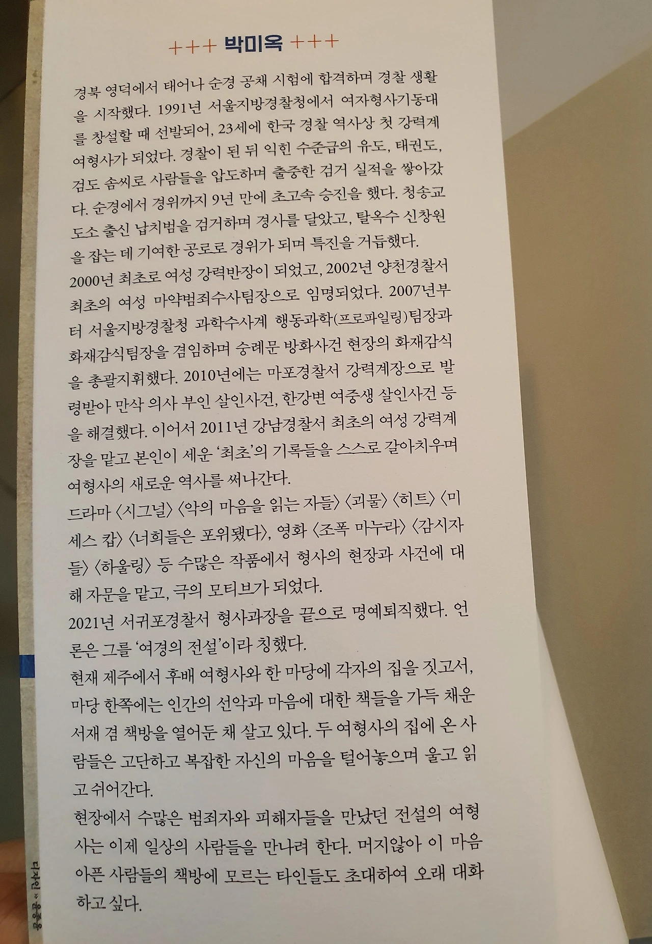형사 박미옥(님)을 알게 된 건 TV <라디오 스타>에서였다. 처음 볼 때는 그냥 자주 나오는 형사님이겠지 싶어서 별 기대가 없었지만, 하시는 말씀이 “나는 TV에 나오는 걸 별로 좋아하지 않고 안 나온다. 방송 요청을 여러 군데에서 해도 나가려 하지 않는다”는 말을 하셨다.