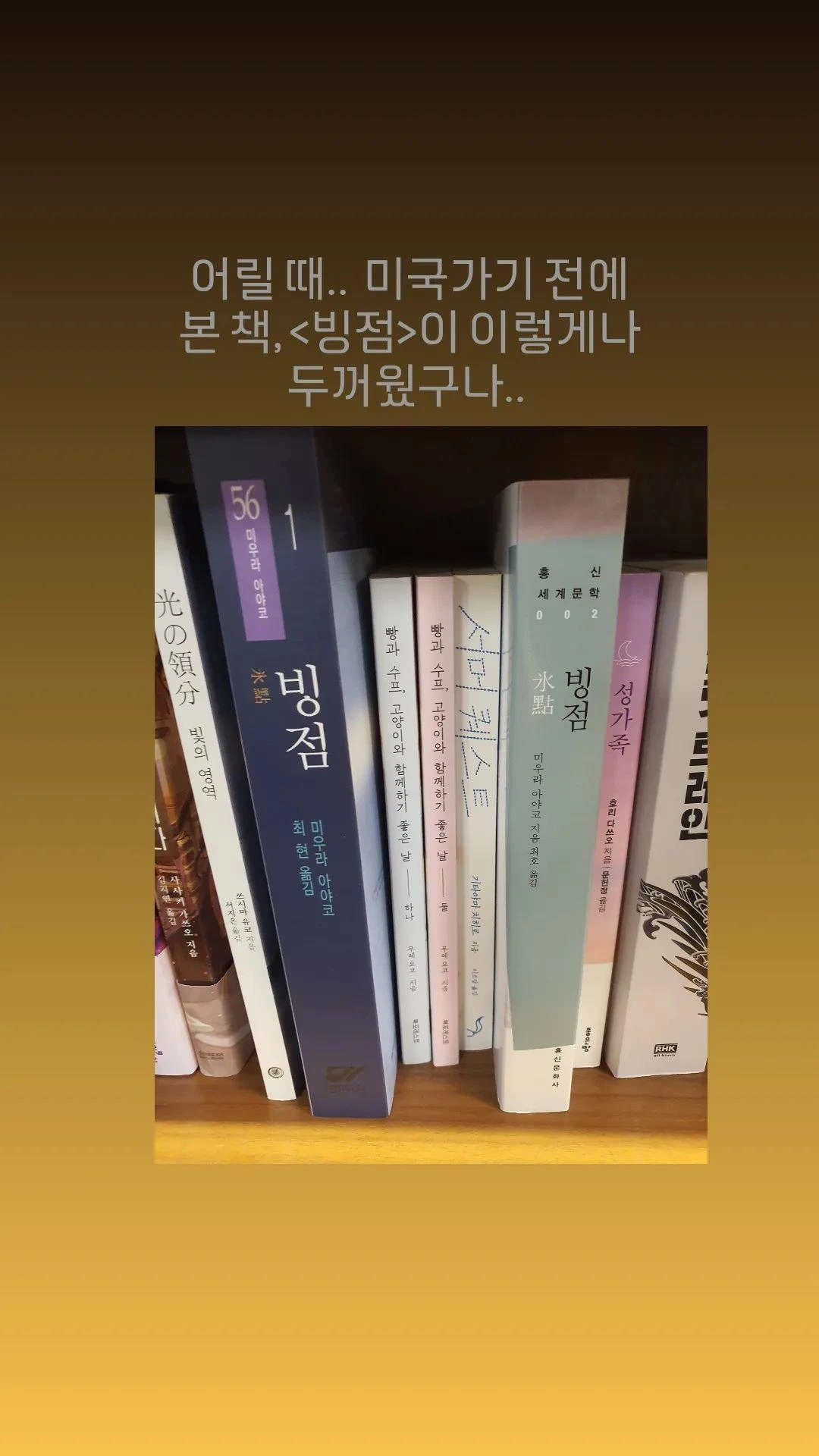 거기서 생각지도 못하게 내가 미국에 가기 전에 읽었던 <빙점>을 봤다. 생각보다 두꺼운 책이라서 조금 당황했고 내가 책 읽기를 좋아했구나.. 싶어서 어제는 옛 추억에 잠겼다.