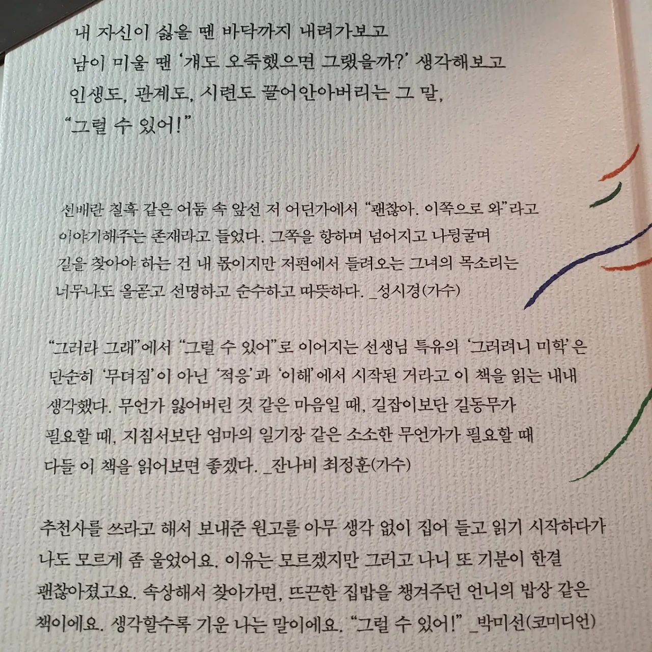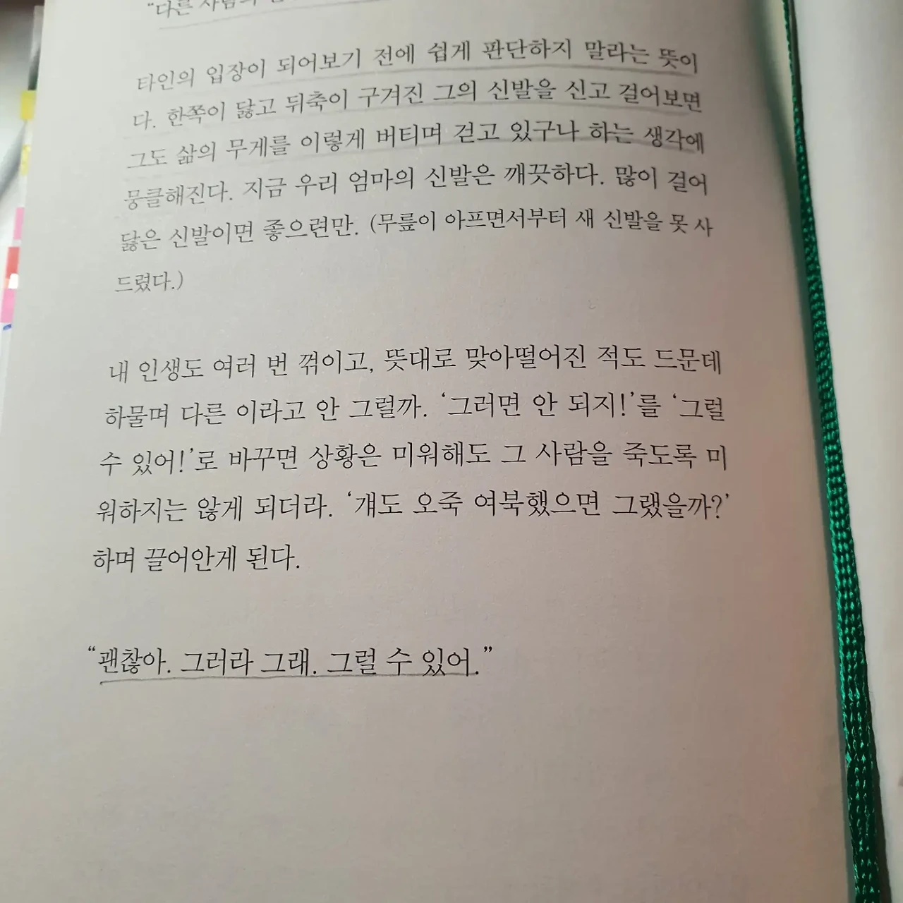나는 '그럴 수 있어'라는 말을 잘 쓰지 않는다. 그럴 수 없는 게 참 많은 사람 같다. 남이 실수한 건 지독히도 잘 기억해서 수년을 이고 지고 기억이 사라지지 않는다. 그럴 수 있지 않은 내가 이 책을 다 읽고 나면 그럴 수 있다고 생각하는 사람이 될까?라는 생각에 멘토 한 분이 있으면 좋겠다는 마음으로 이 책을 대형서점에서 단번에 집어 들었다.