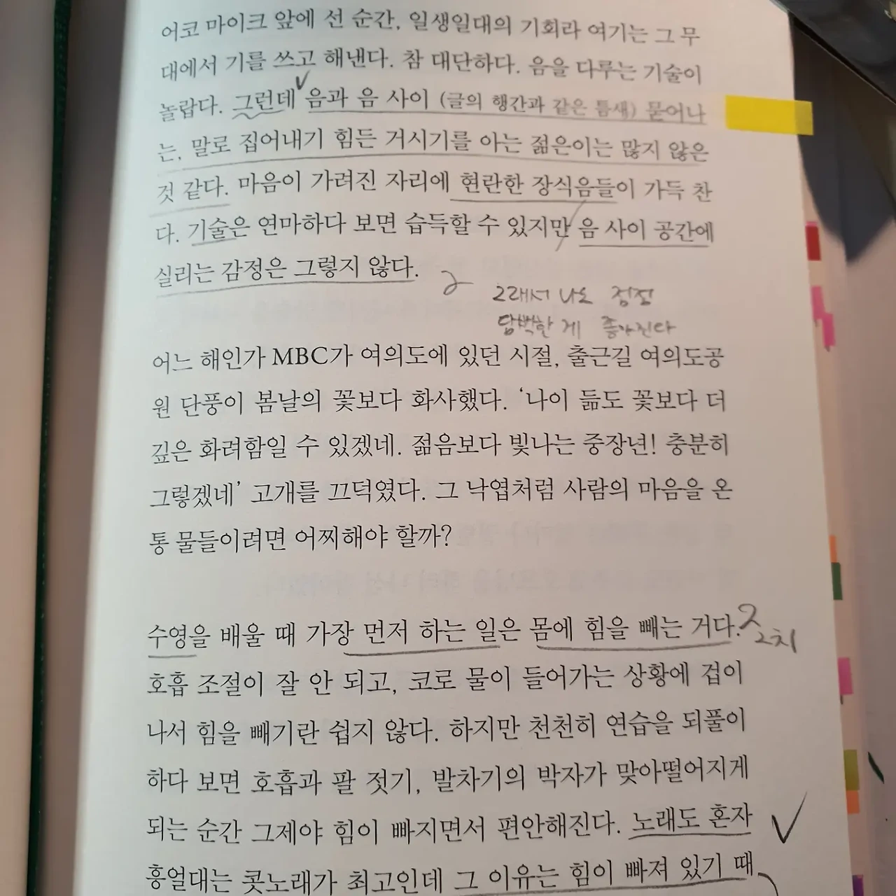 아 노래도 많이 내주시면 좋겠다. 양희은 님은 정말 노래에 진심인 분이라는 걸 이 책을 보면 느끼게 된다. 저렇게 베테랑 프로도 노래할 때 떨리시는구나. 그 떨림이 노래를 마주하는 진심으로 받아들여졌다. 그래서 저렇게 청량하고 고운 소리가 나는 걸까.