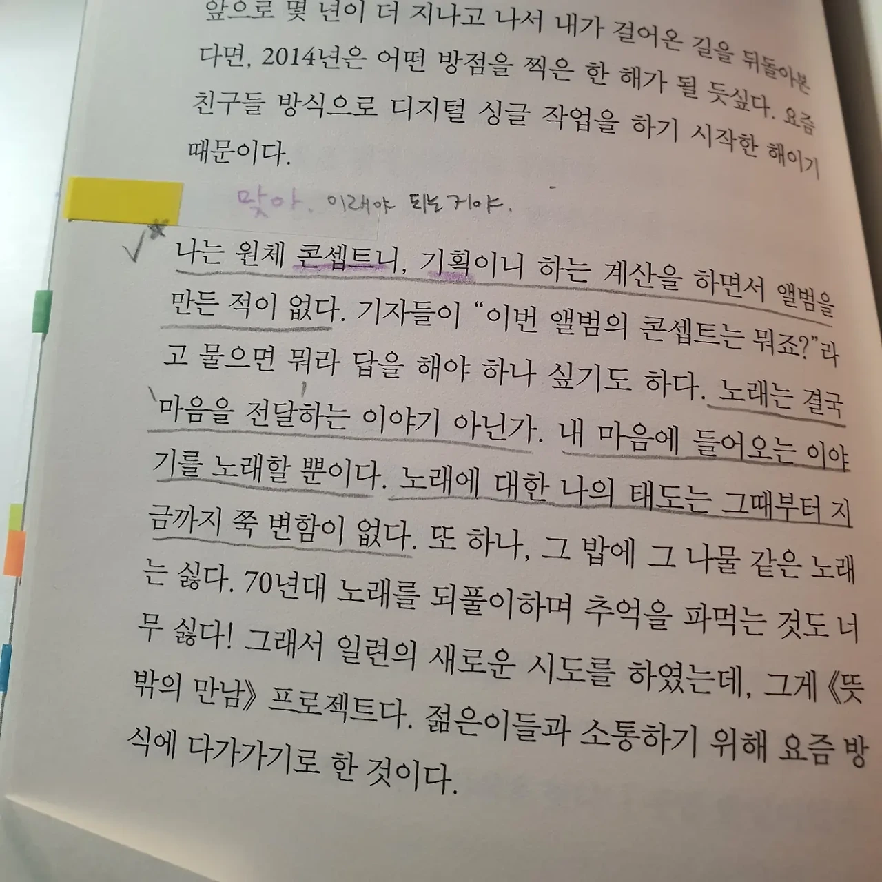 "나는 원체 콘셉트니, 기획이니 하는 계산을 하면서 앨범을 만든 적이 없다. (...) 노래는 결국 마음을 전달하는 이야기 아닌가. 내 마음에 들어오는 이야기를 노래할 뿐이다."_p.114