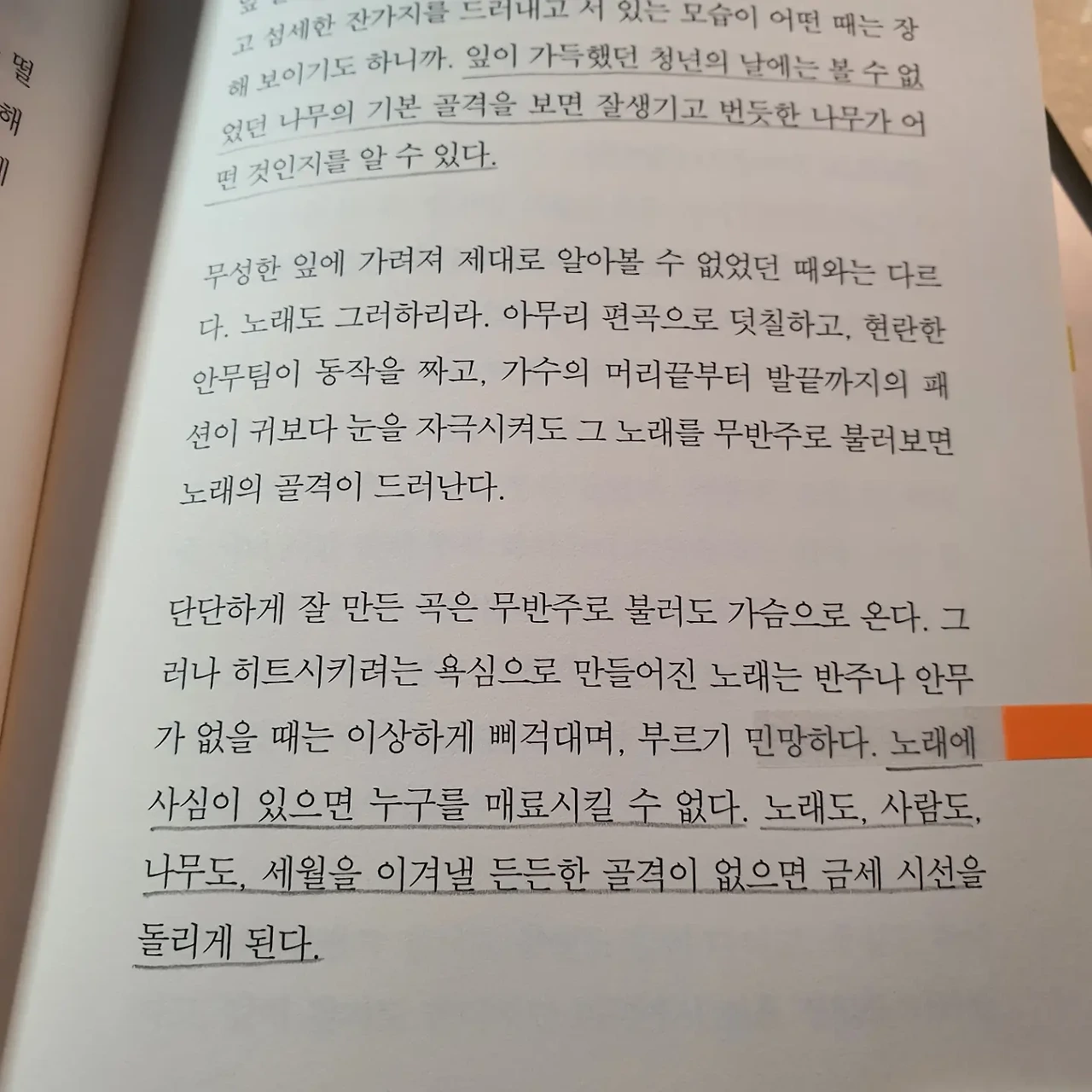 "노래에 사심이 있으면 누구를 매료시킬 수 없다. 노래도, 사람도, 나무도, 세월을 이겨낼 든든한 골격이 없으면 금세 시선을 돌리게 된다."_p.95