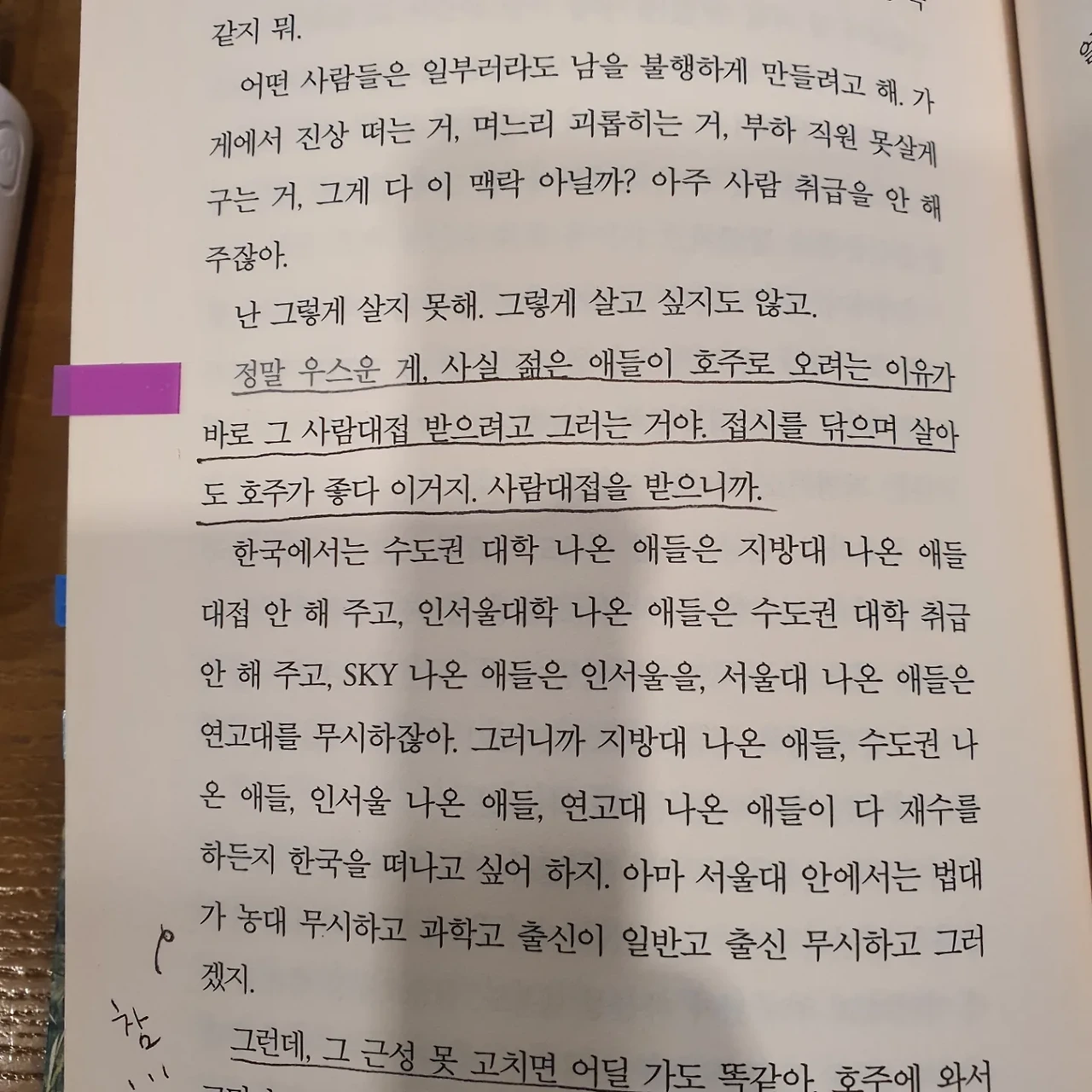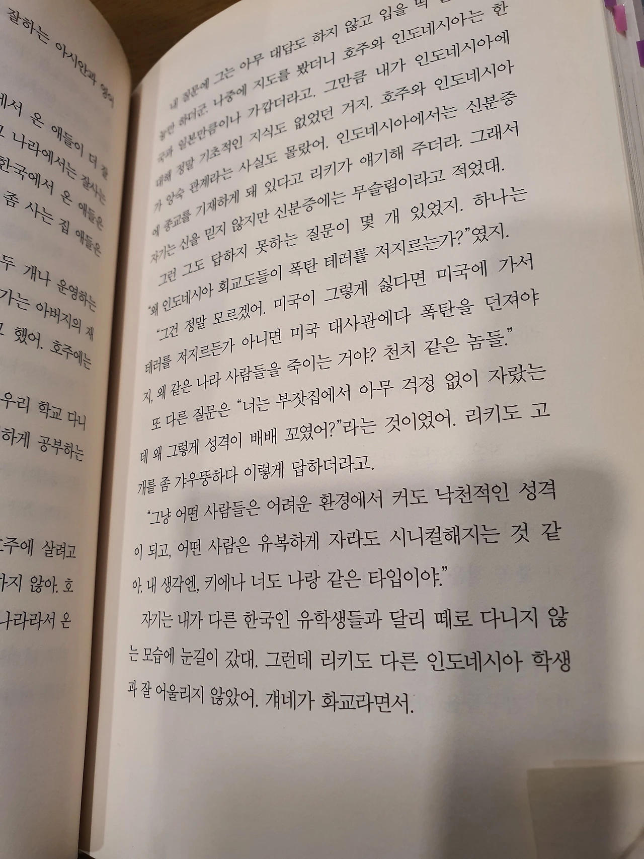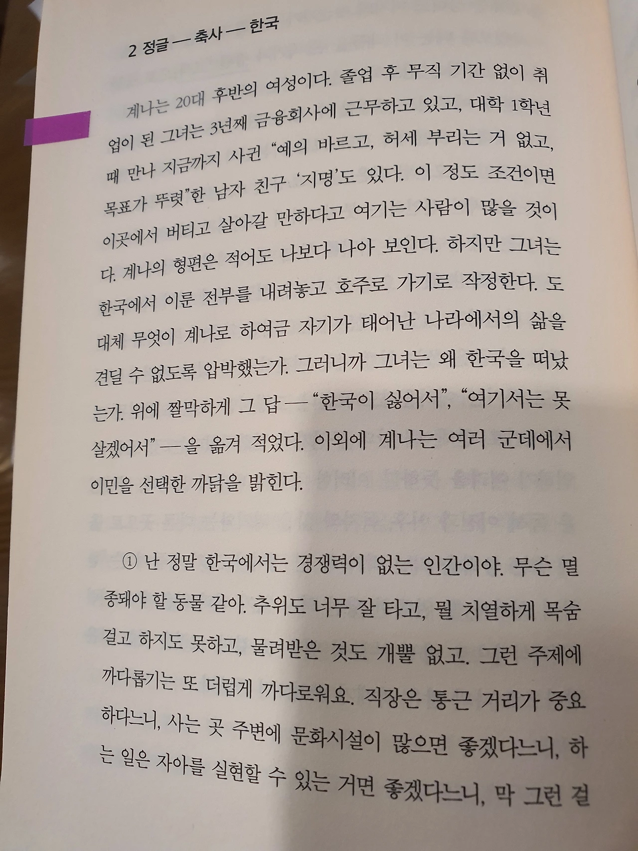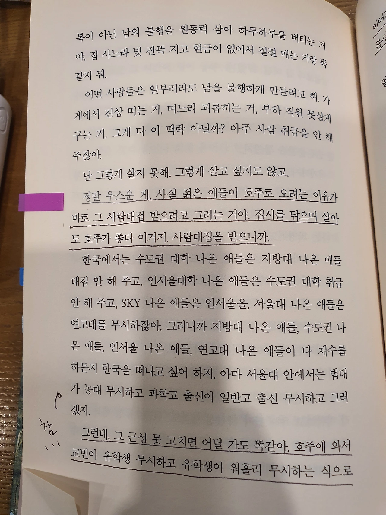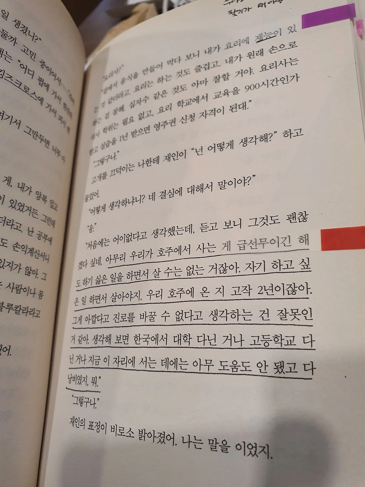 이 책을 통해서 역시나 한국 사회는 암담하고 꽤 암울하고 답답하다는 걸 느낀다. 그럼에도 불구하고 주인공 계나가 호주살이를 어떻게든 끌고 나가서 호주에서 살 수 있는 여건과 상황을 만들어 간 계나에게 기특하다고 고생했다고 말해주고 싶다. 그리고 해외에서 열심히 최선을 다해 살고 있는 젊은 친구들을 응원하게 된다.