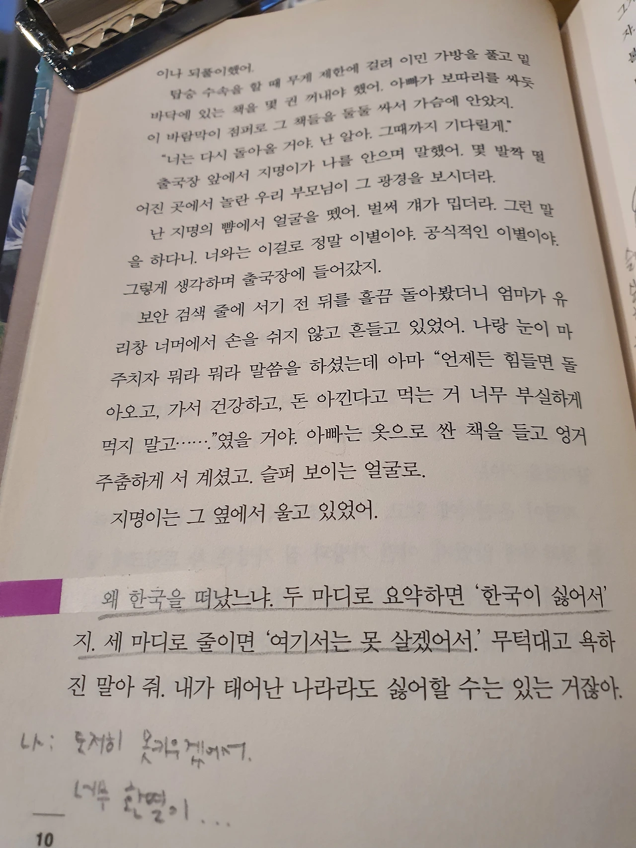 만일 주인공 계나가 지명이를 만나지 않았다면, 지명이 부모를 만나서 그런 아픈 현실을 자각하는 타이밍을 갖지 않았다면 과연 주인공 계나는 '한국이 싫어서'라는 말을 하고 호주로 떠났을까?