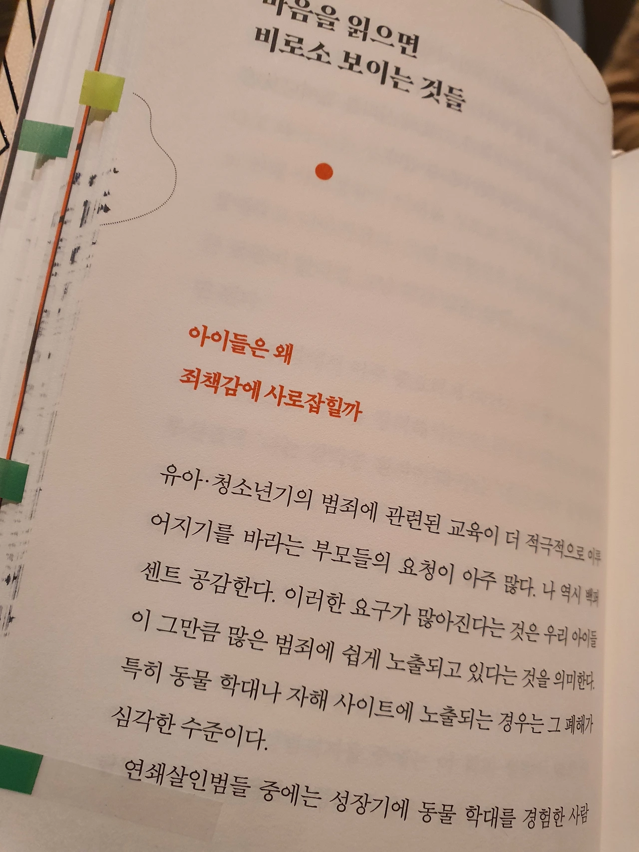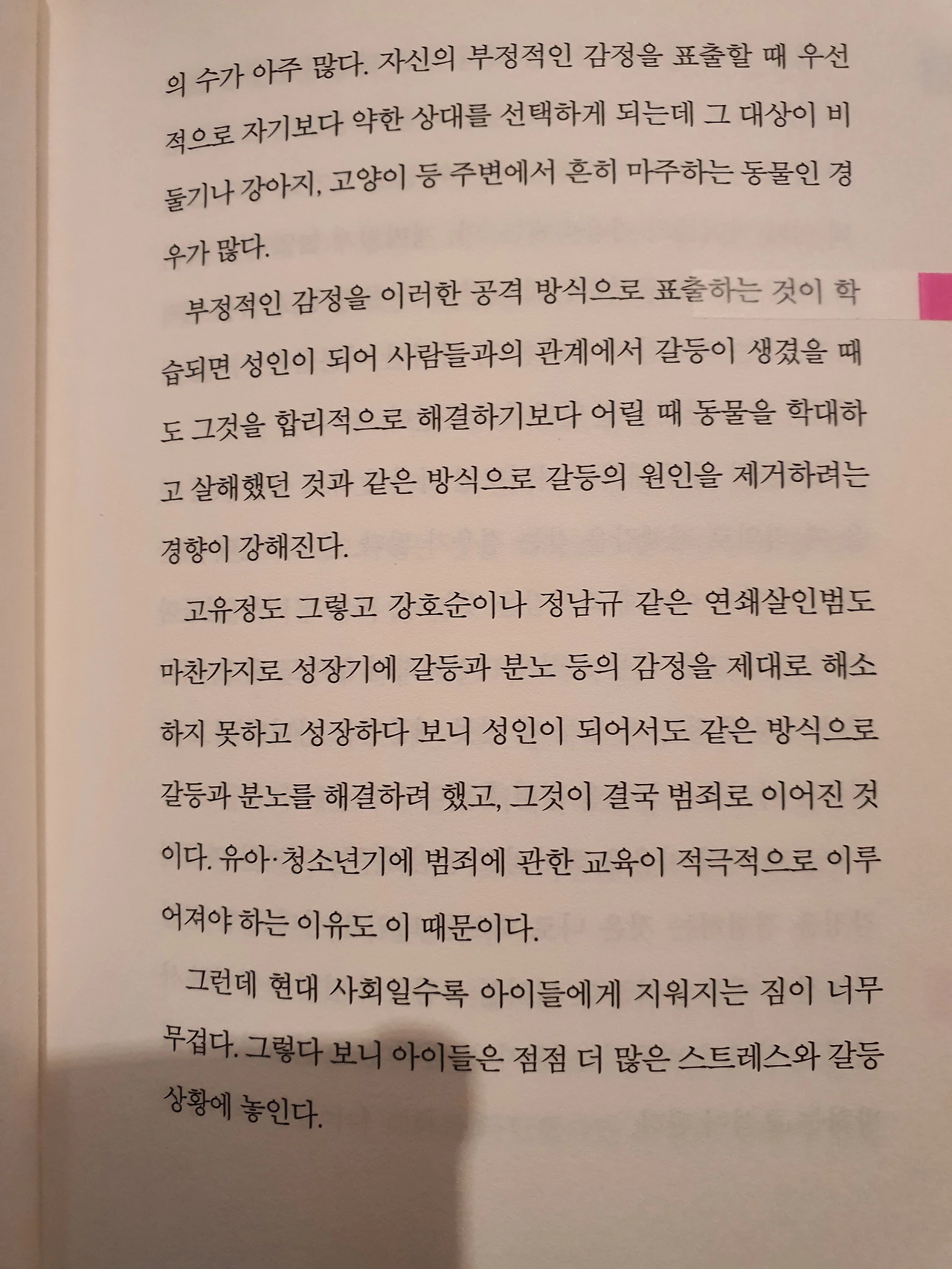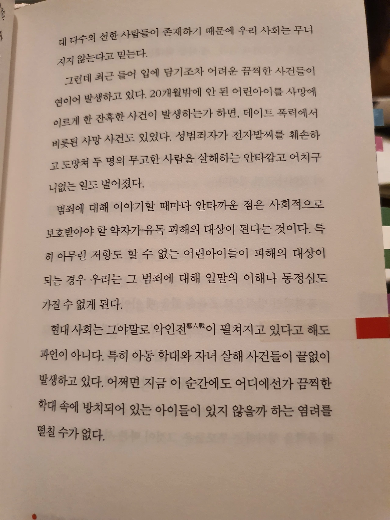 "가끔 범죄 현장에서 두려움을 느끼지 않느냐고 묻는 분들이 있다. 사실 범죄자나 범죄 현장에서 느끼는 두려움보다는 피해자와 피해자의 가족들이 겪는 그 순간의 고통들, 영원히 회복되지 않을 그 고통을 목격하는 것이 훨씬 더 힘들다. 범인을 검거하는 것이 나의 역할이지만 피해자와 가족들이 겪는 고통을 마주하는 순간에는 한없는 죄책감과 고통이 동시에 밀려든다. 특히 아동을 대상으로 한 범죄 현장을 마주했을 때 참을 수 없는 분노와 고통을 경험한다." _p.79