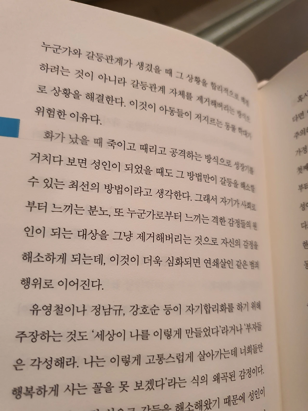 요즘에도 만연한 사이비 종교 집단에 들어가서 나오지 못한 많은 사람들의 이야기를 미디어에서 접할 수 있습니다. 정말 왜 그렇게 될 수밖에 없는 것일까,를 생각해 봤는데요. "사이비 종교 집단에서 가장 먼저 사용하는 수법은 앞에서도 이미 설명했던 '문지방 넘어가기'이다. 학교를 그만두고 가족과 연락을 끊어라, 이제부터 집단으로 생활할 것이다, 사회 문제에 대한 토론회에 참석해 달라, 주말에 개최하는 세미나에 참석해 의견을 제시해 달라 등의 요구를 한다. 세미나, 토론회 등에 참석하면서 자연스럽게 정회원이 되고 나면 요구의 단계가 조금씩 높아진다." _p.219 이 문장들을 보며, 참 사이비 종교 집단은 조금씩 스며들게 만들고 발을 들이는 순간부터는 뺄 수 없게 만들어 버린다는 생각을 합니다.