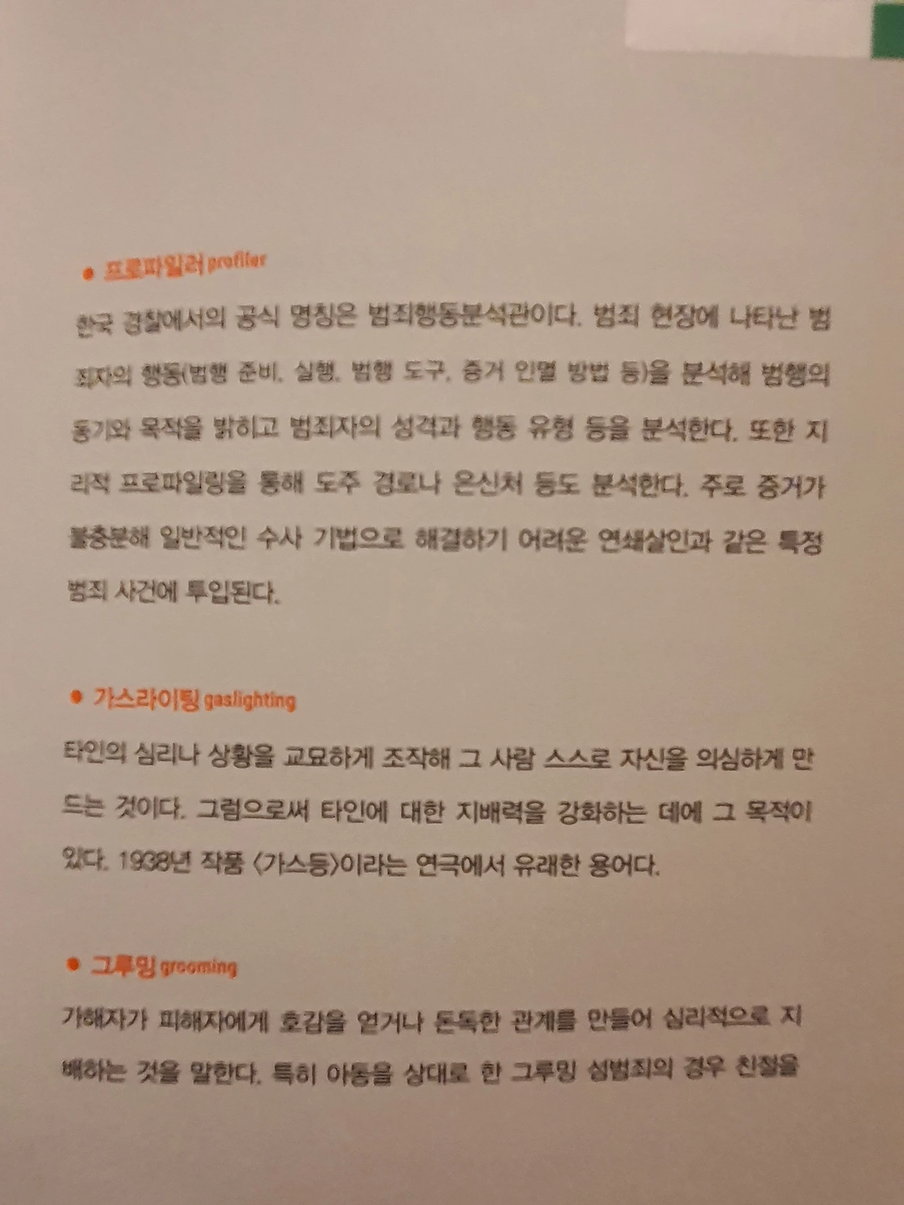 프로파일러, 가스라이팅, 그루밍, 사이버 블링, 촉법소년, 휴리스틱, 확증편향, 역화 효과, 귀인 이론, 포모 증후군, 셉테드 등이 나옵니다.