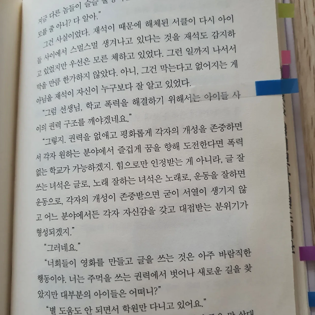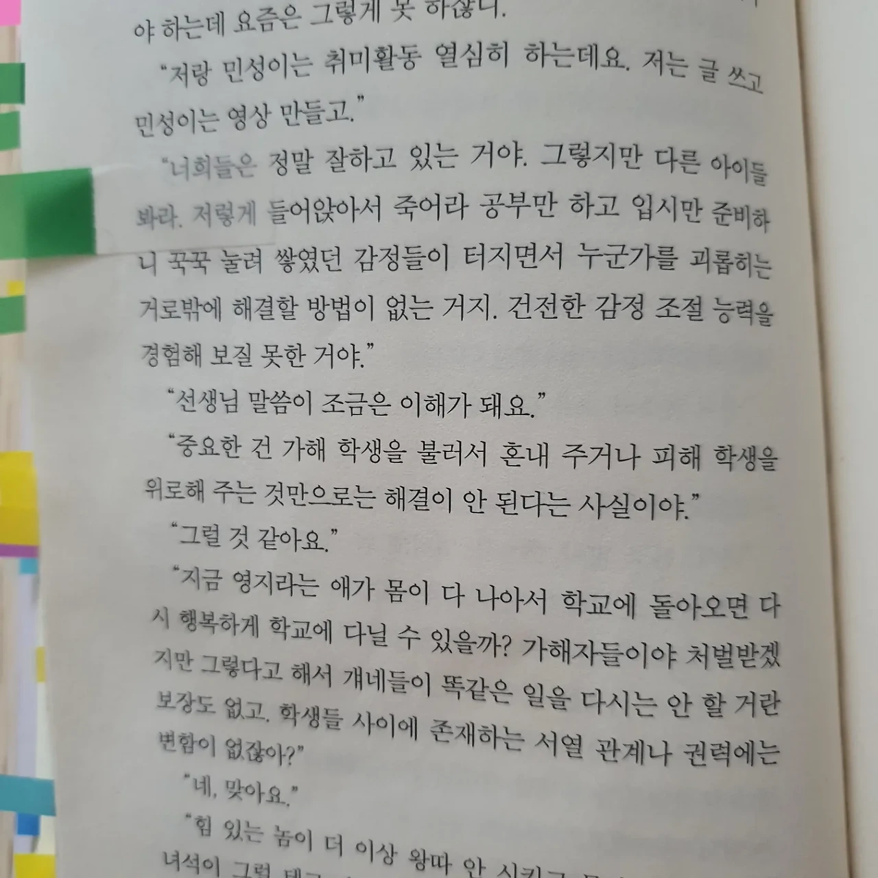 "너희들은 정말 잘하고 있는 거야. 그렇지만 다른 아이들봐라. 저렇게 들어앉아서 죽어라 공부만 하고 입시만 준비하니 꾹꾹 눌려 쌓였던 감정들이 터지면서 누군가를 괴롭히는 거로밖에 해결할 방법이 없는 거지. 건전한 감정 조절 능력을 경험해 보질 못한 거야." _p.130