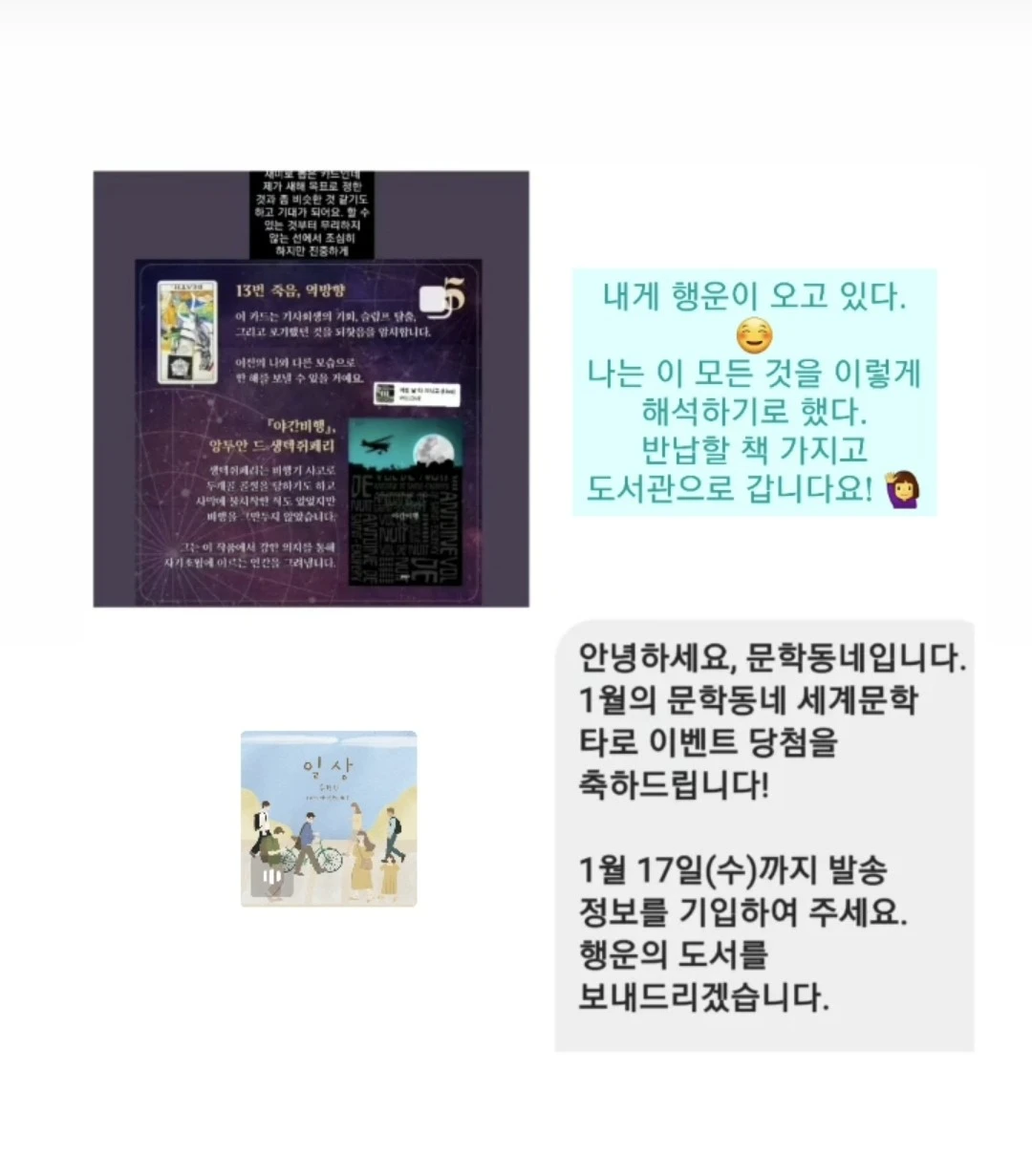 이벤트 성으로 타로 카드를 뽑아서 이렇게 받게 된 문학동네의 세계문학전집을 이렇게 처음으로 읽게 되어 감사하고 영광입니다. 그리고 이렇게 즐겁게 읽을 수 있는 기회를 주심에 다시 한번 감사합니다.