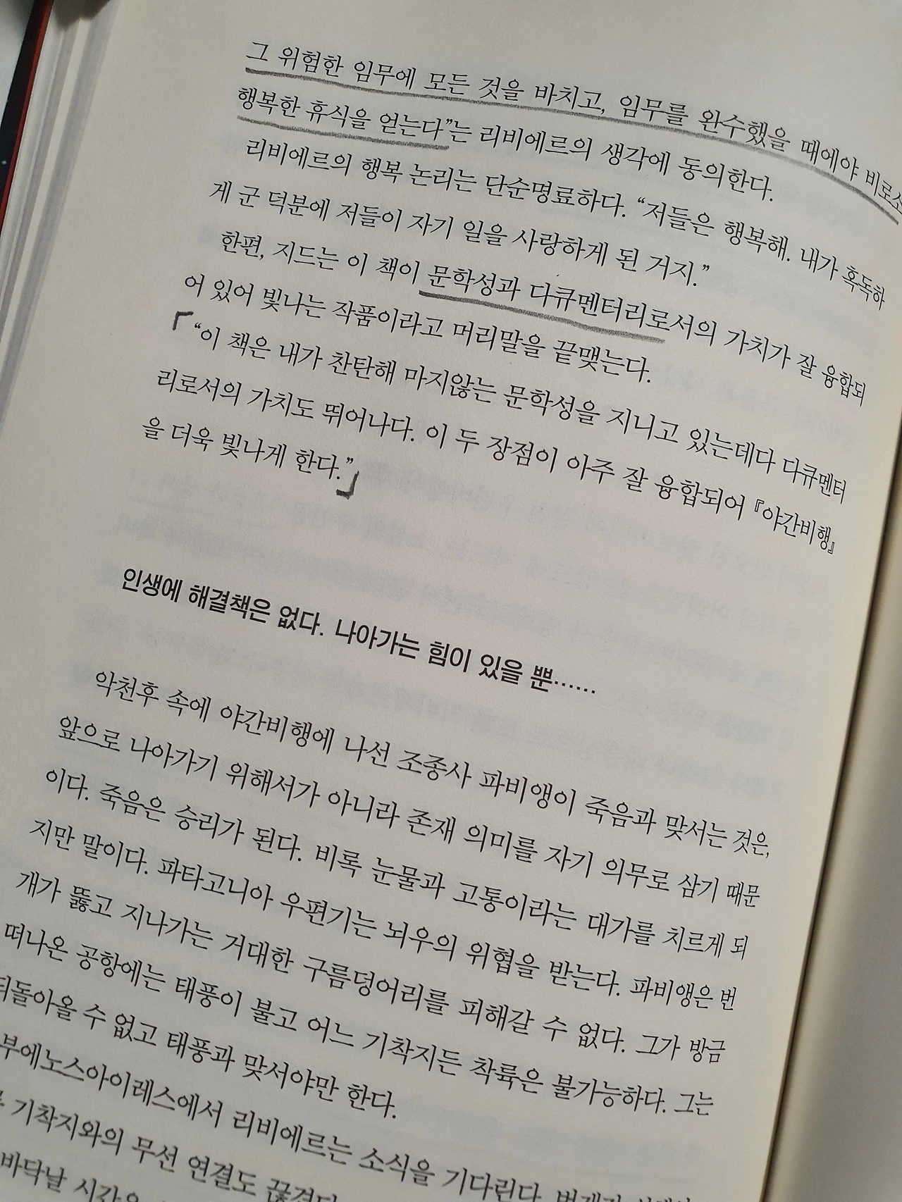 생텍쥐페리의 작품을 읽게 된 건 이번이 두 번째가 된다. 그 유명한 <어린 왕자>를 졸업 시험에서 본 게 처음이었다. 그때는 꾸역꾸역 졸업 시험에 나온다는 여러 권의 책들을 읽고 또 읽고 꼭 한두 명은 떨어진다는 악명 높은 졸업시험에 단번에 붙으려고 애를 쓰며 열심히 읽어낸 그 책은 재미보다는 의무에서 읽었다. 하지만 이번에는 정말 술술 읽히기도 했고, 다시 돌아가서 그 부분을 또 읽고 잠깐 눈을 감아 보기도 했다. 생각이 많은 사람들에게는 딱인 이 책의 구절구절을 살피며 내밀한 내 마음을 들여다 보기에는 지금 딱 좋은 책 같다.
