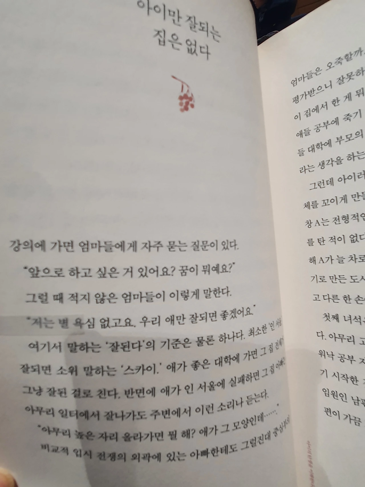 세상이 바뀌지 않았는데 아이들을 남들이 가지 않는 완전히 다른 길로 가봐, 가봐도 돼,라고 하는 건 아이들에게 너무 가혹한 것 같다는 생각을 할 때가 종종 있었습니다. 물론 저도 아이들을 양육하며 예기치 않게 맞닥뜨린 여러 일들로 인해 많은 고민을 했던 것 같습니다.