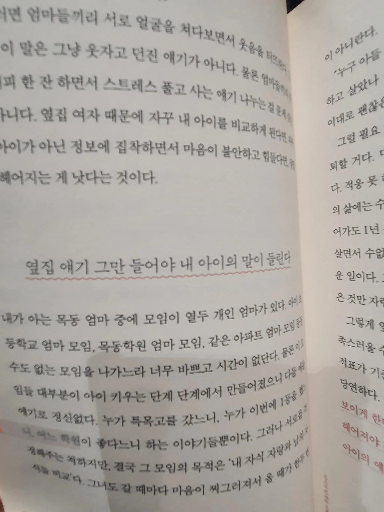 김미경 님의 이 책은 공감하는 부분이 참 많습니다. 음.. 나와 상당히 다른 분이라고 생각했는데 생각이 비슷한 게 많구나,라는 걸 오늘 처음 느꼈구요. 하지만 다르게 생각하는 부분도 조금 있습니다. 제가 24년 차 엄마에, 전공한 분야, 경험한 분야가 있으니 조금 다를 수밖에 없는 것 같습니다.