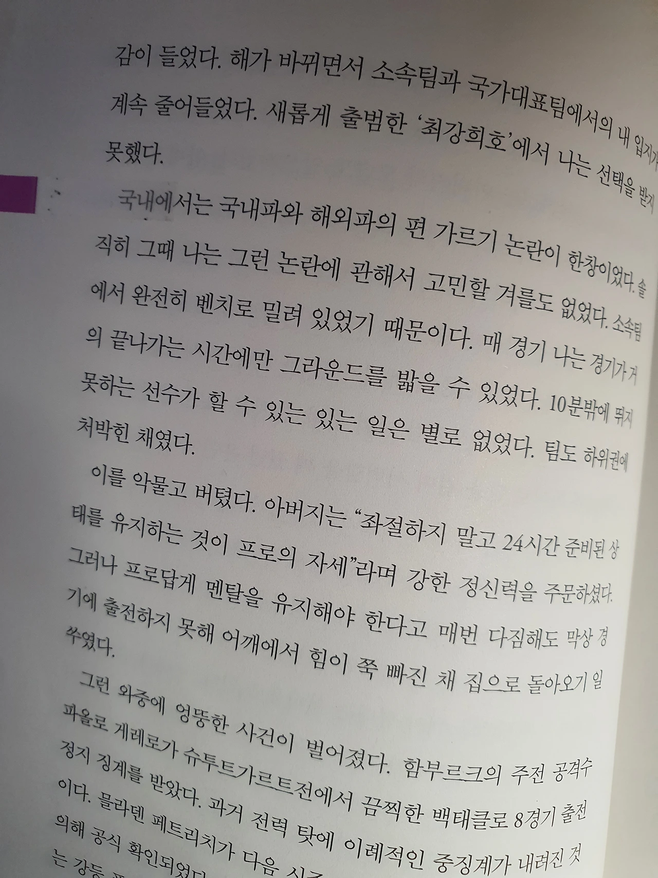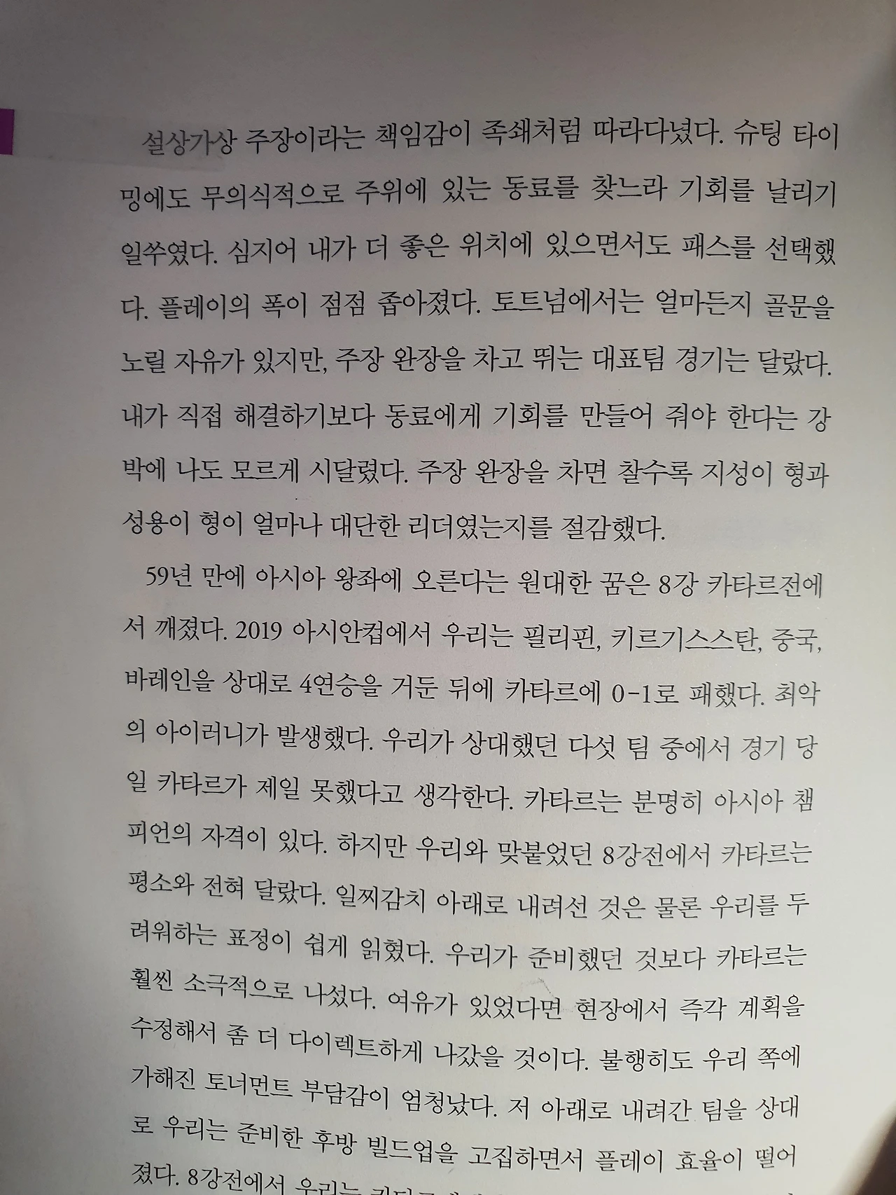 "설상가상 주장이라는 책임감이 족쇄처럼 따라다녔다. 슈팅 타이밍에도 무의식적으로 주위에 있는 동료를 찾느라 기회를 날리기 일쑤였다. 심지어 내가 더 좋은 위치에 있으면서도 패스를 선택했다. (...)" _p.270