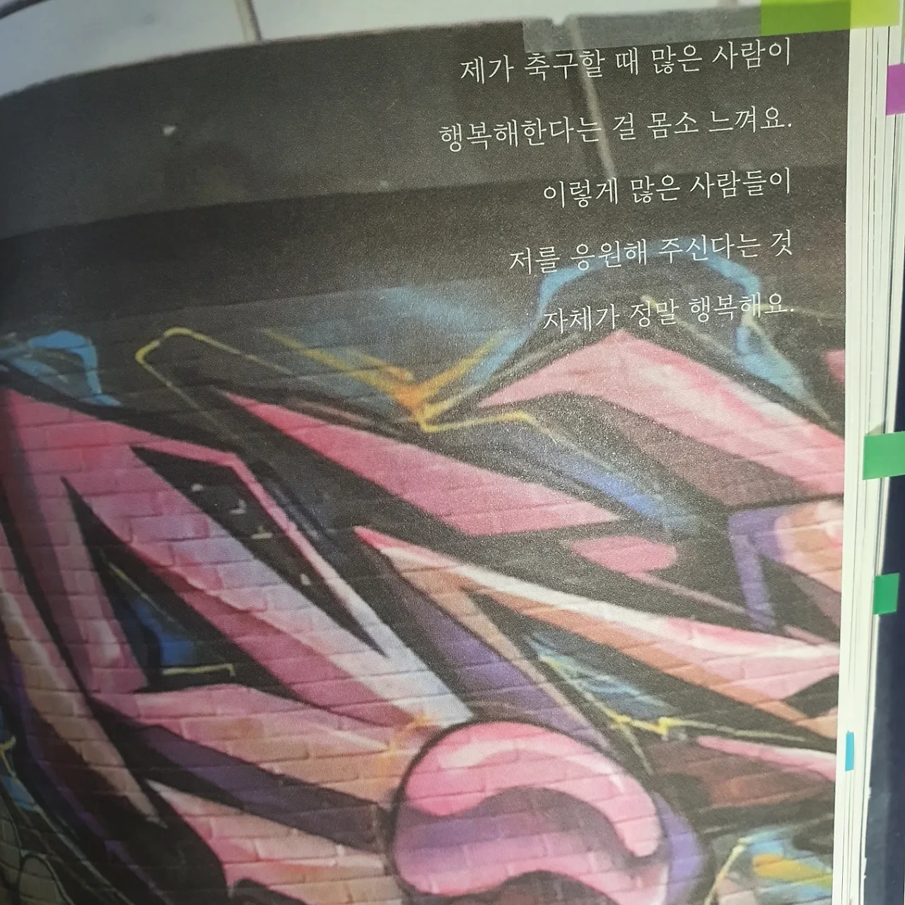 "그라운드 안에서는 모든 게 행복하다. 그곳에는 내가 제일 좋아하고 제일 잘할 수 있는 축구가 있다. 플레이만 신경 쓰면 되니까 편하다. 골까지 넣는 순간에는 세상 누구도 부럽지 않다. 훈련도 마찬가지다. 시작부터 끝까지 훈련에만 집중할 수 있어서 마음이 편하다. 그라운드에서 벗어나면? 꿈에서 현실로 돌아온다. (...) 24시간 내내 그라운드에서 볼만 ㄴ차면 좋겠다고 생각했다." _p.217