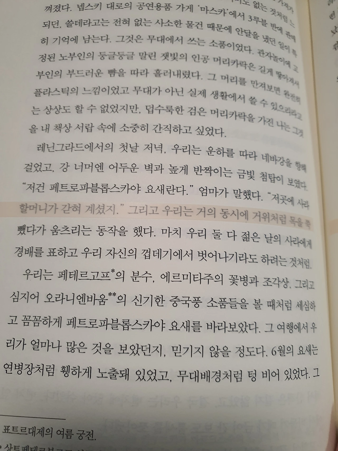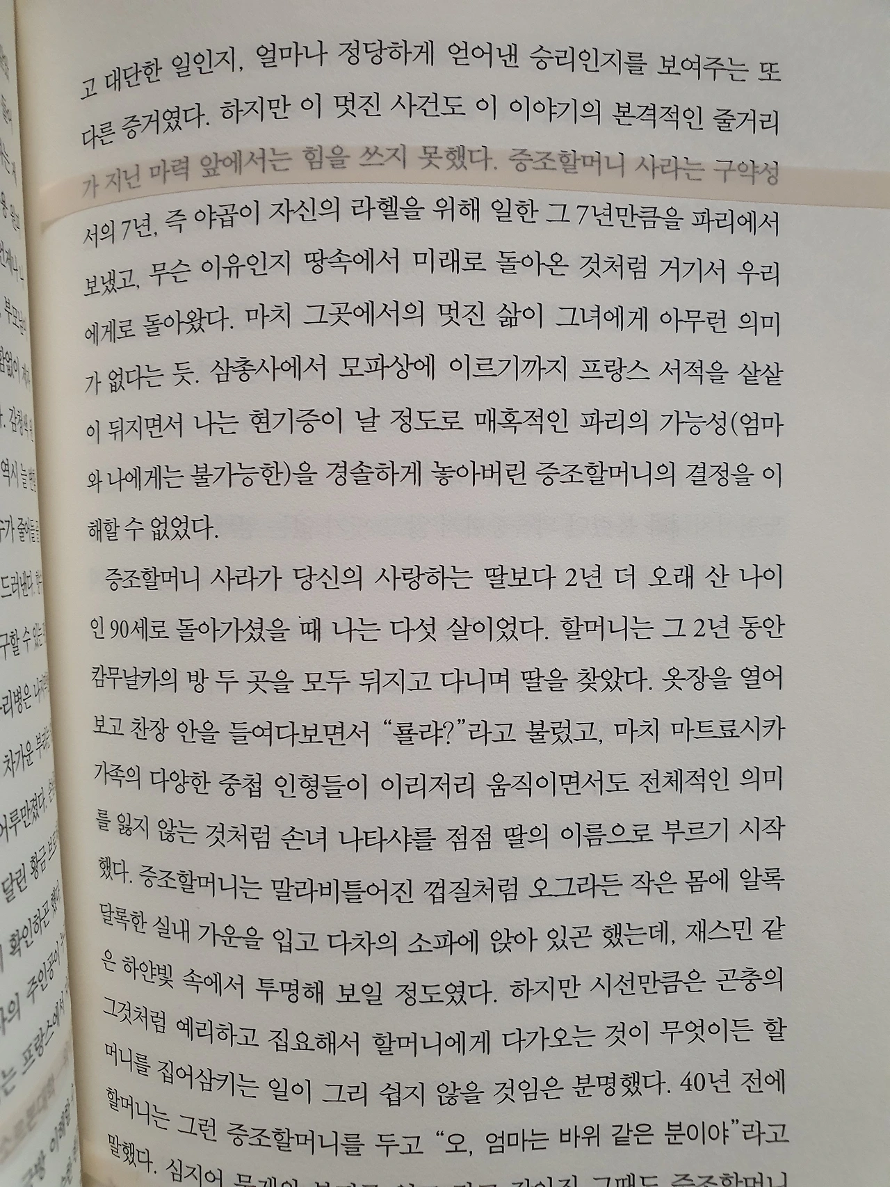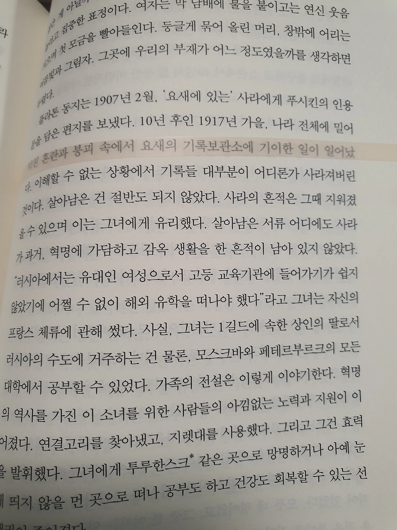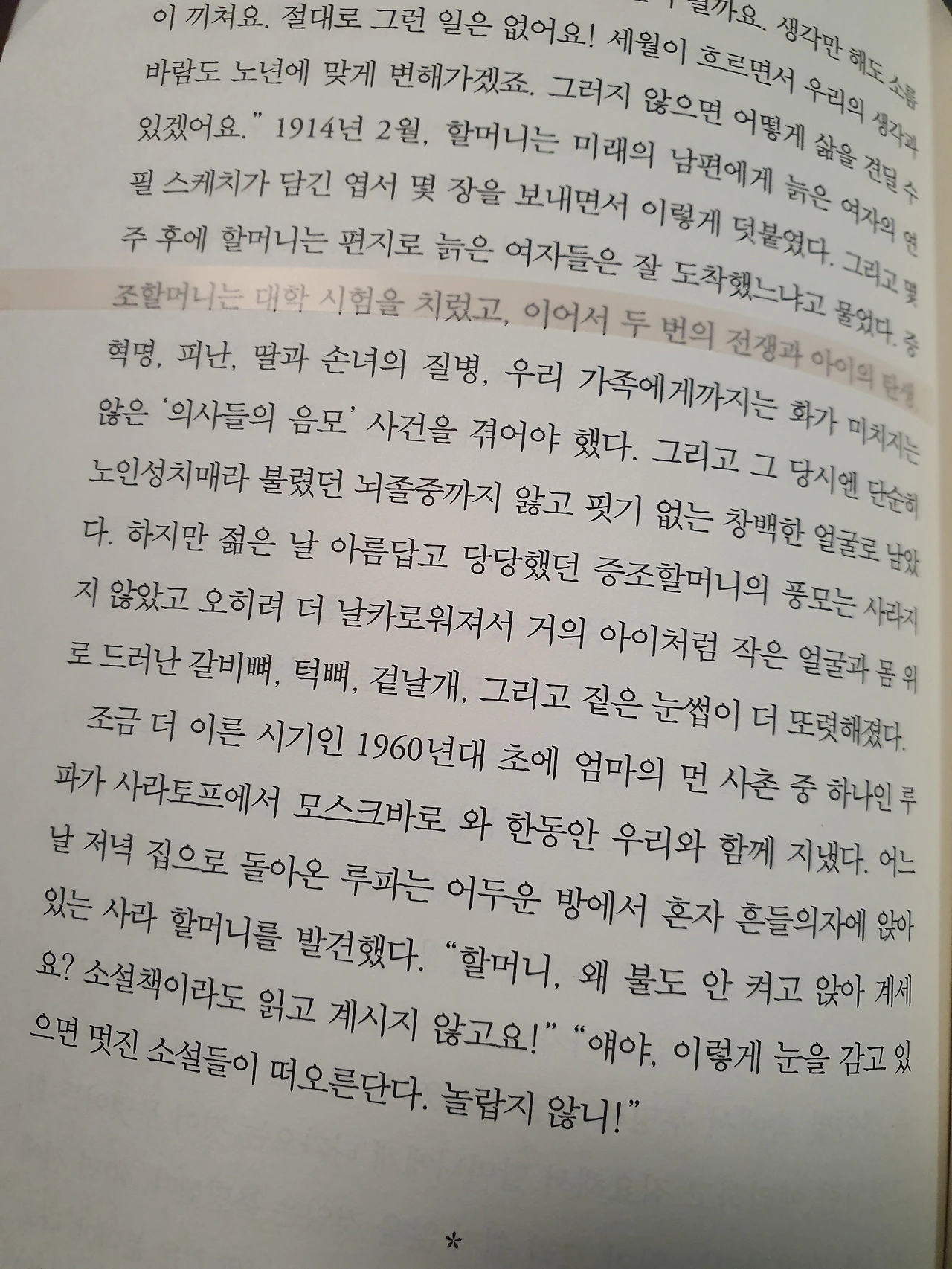 "증조할머니는 대학 시험을 치렀고, 이어서 두 번의 전쟁과 아이의 탄생, 혁명, 피난, 딸과 손녀의 질병, 우리 가족에게까지는 화가 미치지는 않은 '의사들의 음모' 사건을 겪어야 했다. (...)" _p.458