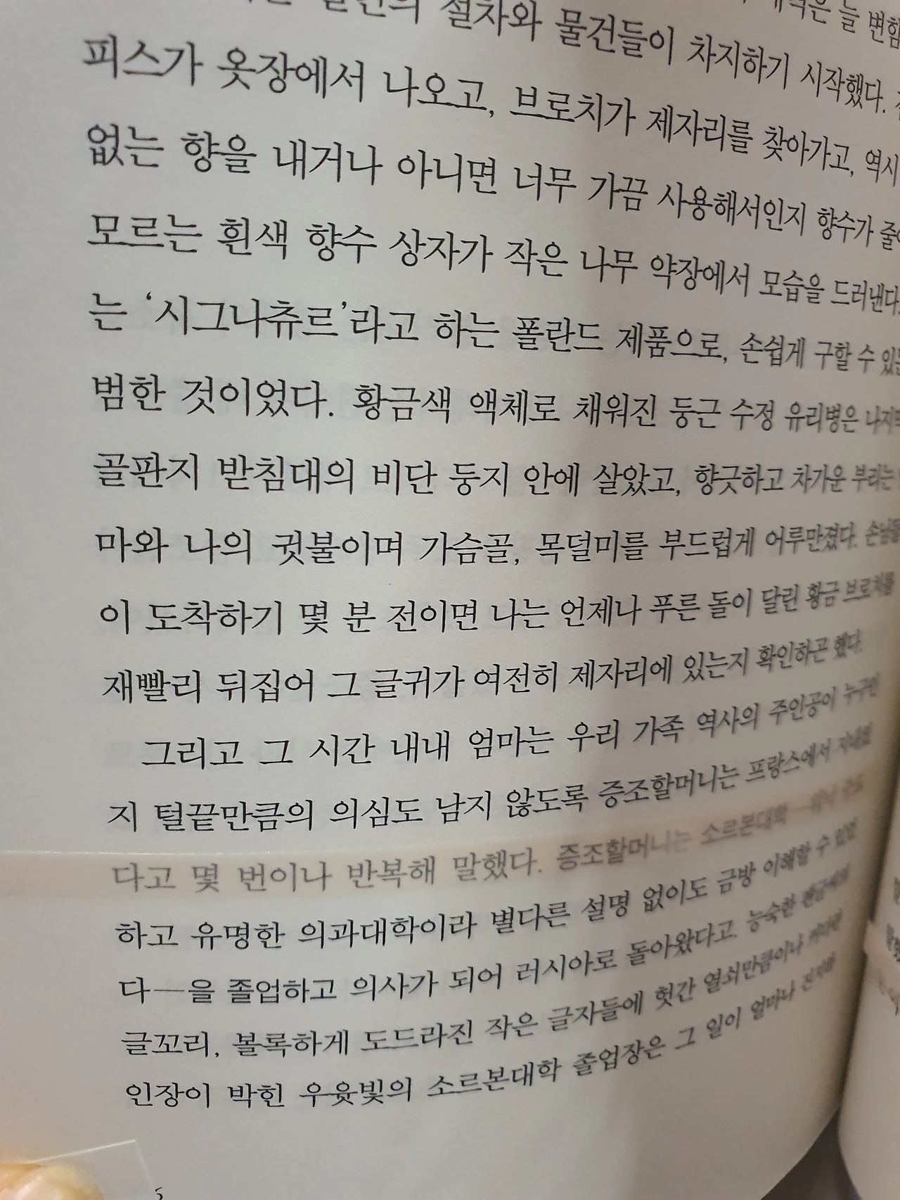 "증조할머니는 소르본대학 --- 워낙 중요하고 유명한 의과대학이라 별다른 설명 없이도 금방 이해할 수 있었다 --- 을 졸업하고 의사가 되어 러시아로 돌아왔다고. (...) 하지만 이 멋진 사건도 이 이야기의 본격적인 줄거리가 지닌 마력 앞에서는 힘을 쓰지 못했다. 증조할머니 사라는 구약성서의 7년, 즉 야곱이 자신의 라헬을 위해 일한 그 7년만큼을 파리에서 보냈고, 무슨 이유인지 땅속에서 미래로 돌아온 것처럼 거기서 우리에게로 돌아왔다. 마치 그곳에서의 멋진 삶이 그녀에게 아무런 의미가 없다는 듯. 삼총사에서 모파상에 이르기까지 프랑스 서적을 샅샅이 뒤지면서 나는 현기증이 날 정도로 매혹적인 파리의 가능성(엄마와 나에게는 불가능한)을 경솔하게 놓아버린 증조할머니의 결정을 이해할 수 없었다." _p.457