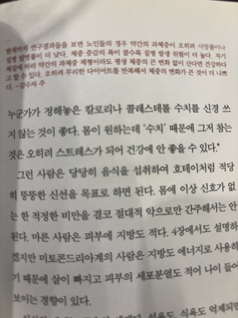 그런데 “현재까지 연구결과들을 보면 노인들의 경우 약간 과체중이 오히려 사망률이나 질병 발병률이 더 낮다. 체중 증감의 폭이 클수록 질병 발생 위험이 더 높다. 자기 체질에 따라 약간의 과체중 체형이라도 평생 체중의 큰 변화 없이 산다면 건강하다고 할 수 있다. 오히려 무리한 다이어트를 반복해서 체중의 변화가 큰 것이 더 나쁘다.” _95