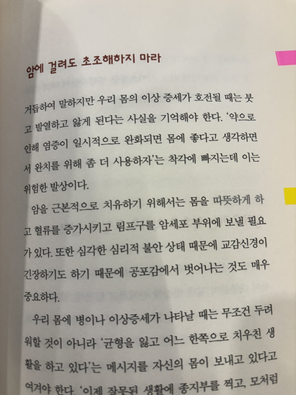 암이 걸렸더라도 마음 편히 생각하라고 한다. 처방받는 약이 몸에 다 좋다고 생각하지 않는다는 점도 역시나 마음에 와닿았다.
